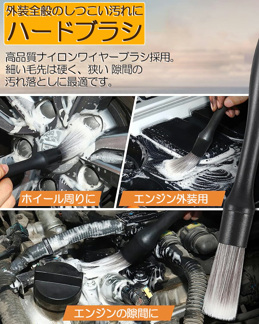 【使いやすい3種類セット】ディテールブラシは硬さの異なる3本セットで様々なシーンでお使いいただけます。車内の掃除だけでなく、車体、ホイール、掃除が難しい隙間の掃除にも使用できます。