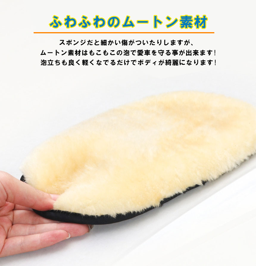 【洗車で愛車を傷つけない!】 手洗い洗車の必需品。ふわふわの羊毛のムートン素材で驚きの細かな泡立ちを実現! 軽くなでるだけでボディがきれいに! スポンジと違い砂を引きずらず、毛の部分が大量に水分を吸ってくれることで水のクッションを作りキズを軽減してくれます。柔らかな素材なので細やかな曲線や凹凸にも対応