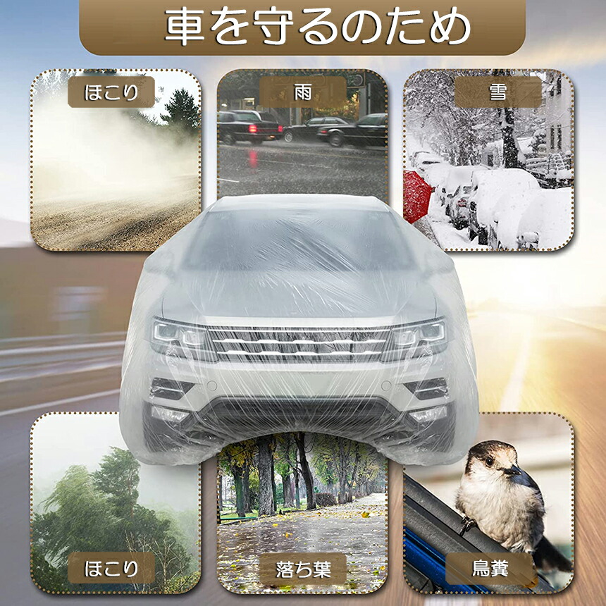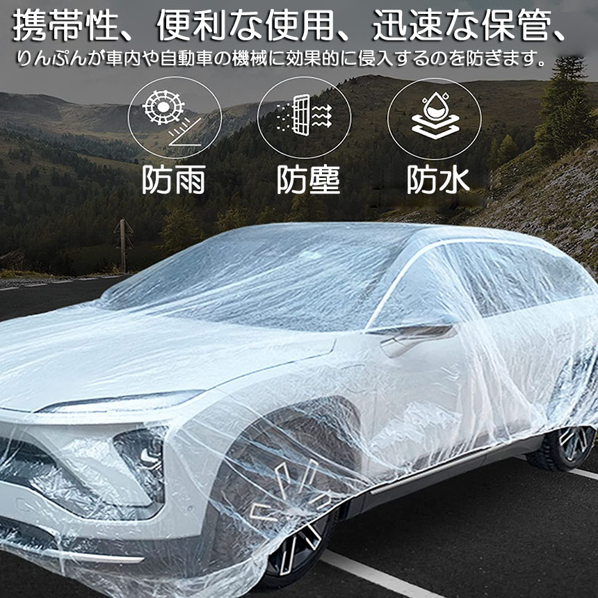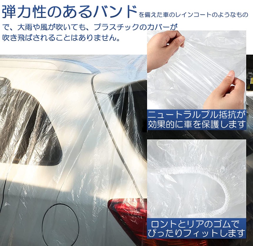 ●耐久性:使い捨ての透明な車のカバーは、弾力性のあるバンドを備えた車のレインコートのようなもので、大雨や風が吹いても、プラスチックのカバーが吹き飛ばされることはありません。