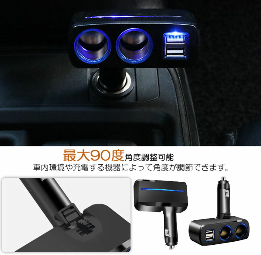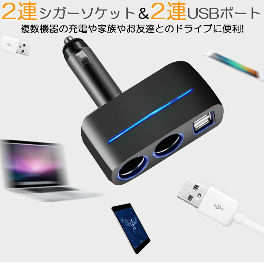 【車内に設置し各機器の電源に】車用のシガーソケット分配器です。一つのシガーソケットから、シガーソケット×2・USBポート×2に分配することが出来ます。