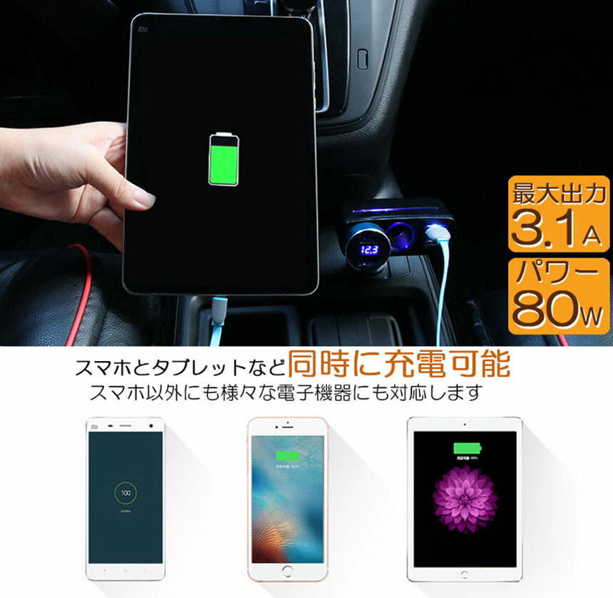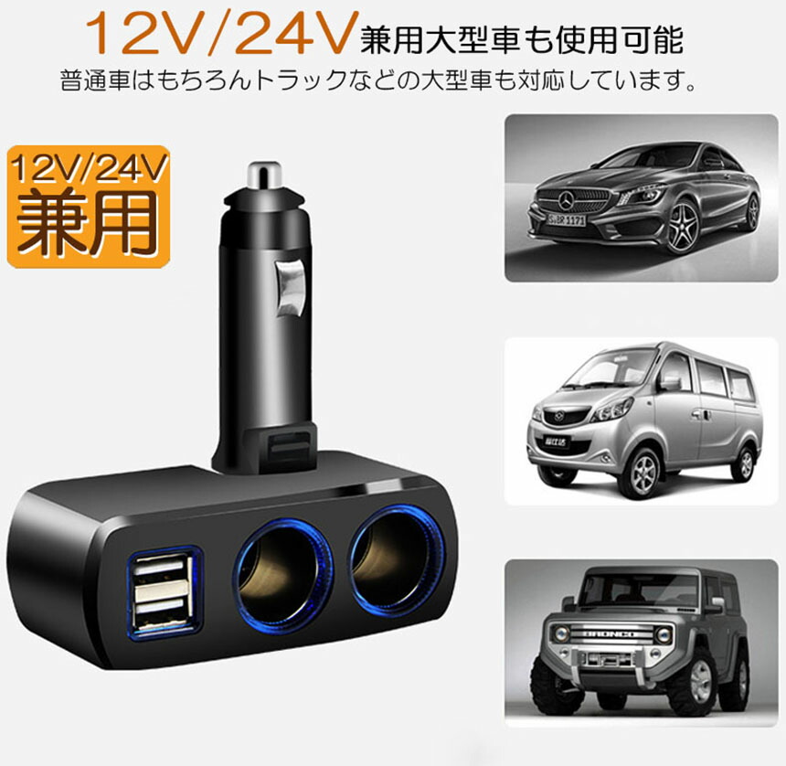 【製品仕様】入力電源:12V/24V (普通車やトラックでも使用可) 出力:シガーソケットx2口 USB(タイプA)x2ポート USB出力電圧:DC5V USB出力電流:3.1A(最大)予備ヒューズ付