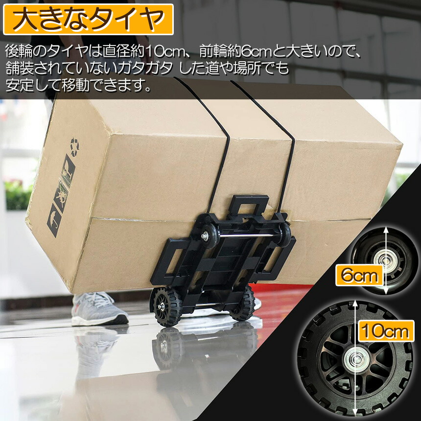 【大きいタイヤで抜群の安定感】 後輪のタイヤは直径約10cmと大きいので、舗装されていないガタガタした道や場所でも安定して移動できます。