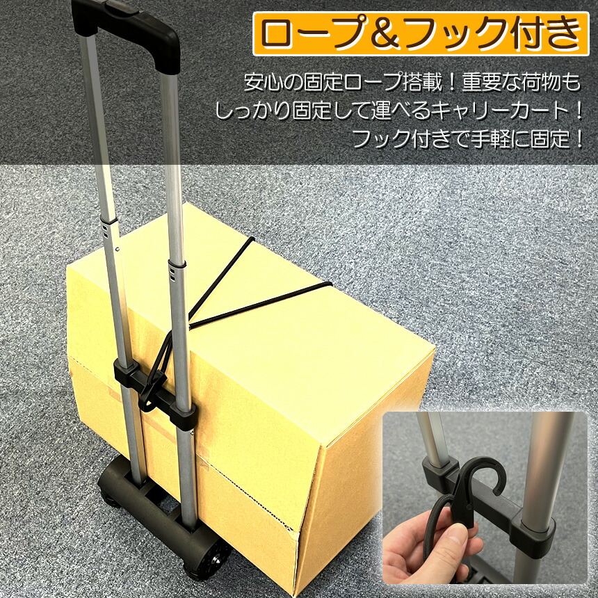 4.荷台に荷物を積んで、ゴム紐で飛び出さないように固定します。 【 ハンドルの長さ調整方法 】