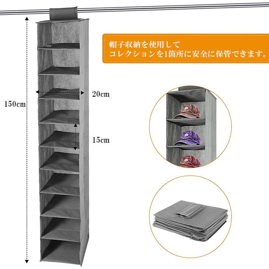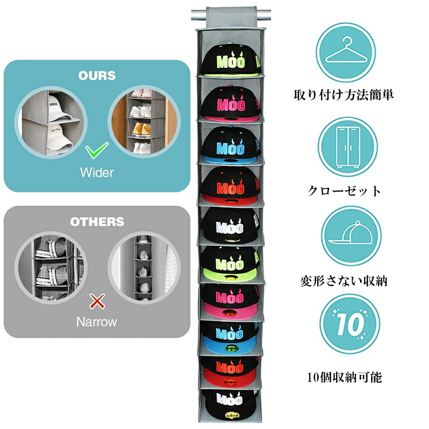 【キャップを収納できる】クローゼットの中で吊り下げ収納を行え。10段の広々とした収納空間を備えているので、たくさんのキャップを収納できます。重ねて保管せずに、1つずつ個別に飾れます。
