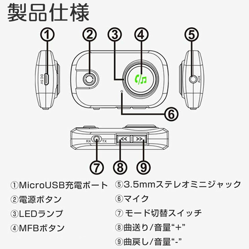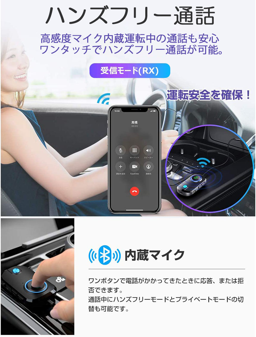 【音声アシスタント・ハンズフリー通話・Bluetooth非対応車での音楽再生】Bluetooth送受信機と、車との相性は抜群です。Bluetooth非対応のカーステレオでも、Bluetoothに接続した端末の音楽を再生できます。さらに、、本機には、ミニマイクが内蔵されているので、本機に向かって、音声アシスタントに命令し、曲の変更や、電話をかける、メッセージの送信などもスムーズにできます。通話中にボタンを長押しすれば。ハンズフリー通話モード/携帯でのプライベート通話モードの切替も簡単です!運転中も安全にスマホの機能を楽しめます。