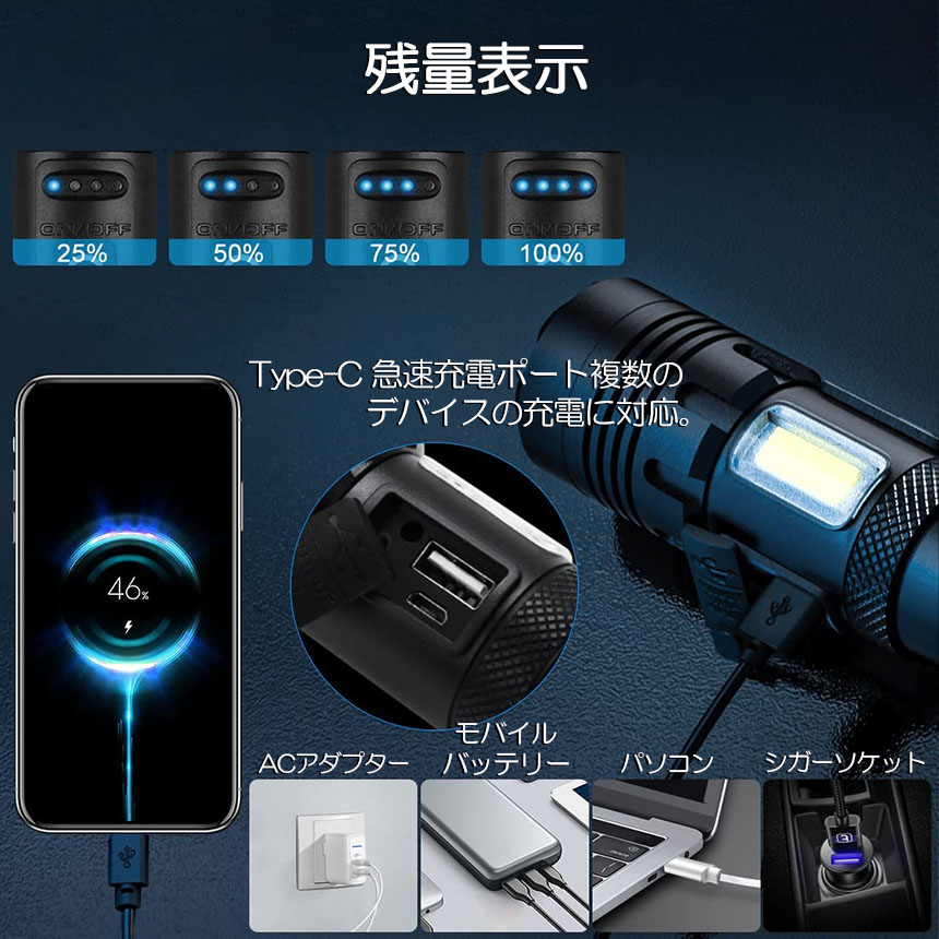 【USB出力機能★Type-C充電★多種類電池に対応】最新世代のledライトにはUSB出力ポート付き、モバイルバッテリーとして使用可能、緊急時にスマホや小型機器を充電できます。Type-C充電ポートが搭載されており、通常のMicro-usb充電よりも10%高速です。5V/2Aで充電した場合、約3時間でフル充電になります。5000mAhの大容量充電池付き、何度も充電ができで繰り返す利用可能です。災害や停電など非常時や充電が難しい場合にも安心です。