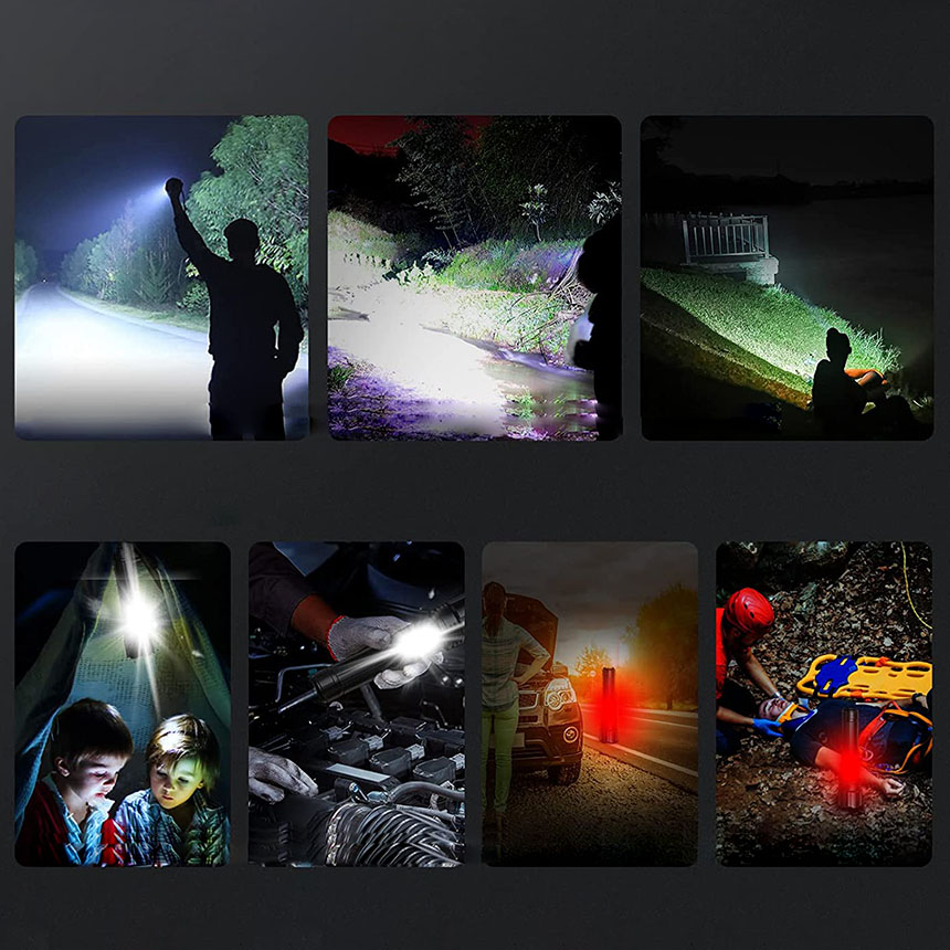 【超高輝度XHP160+COB作業用ライト】懐中電灯は最新アップグレード高輝度XHP160を搭載し、16個LEDランプビーズで構成されており、いずれかが壊れても他のビーズの使用に影響を与えず、使用寿命が長くなります。明るさは通常のT6照明の7倍、緊急停電の時、COBの白いライトは子供用のデスクライトとして働き、家庭作業の書き込みを行うことができます。釣りの時、COBの赤い光で餌を換えたり、蚊を駆除したりできます。屋外緊急時には、COBの赤いフラッシュモードが救助信号として機能します。様々な照明パターンが室内外のすべての夜間シーン照明に完璧に適用されます。