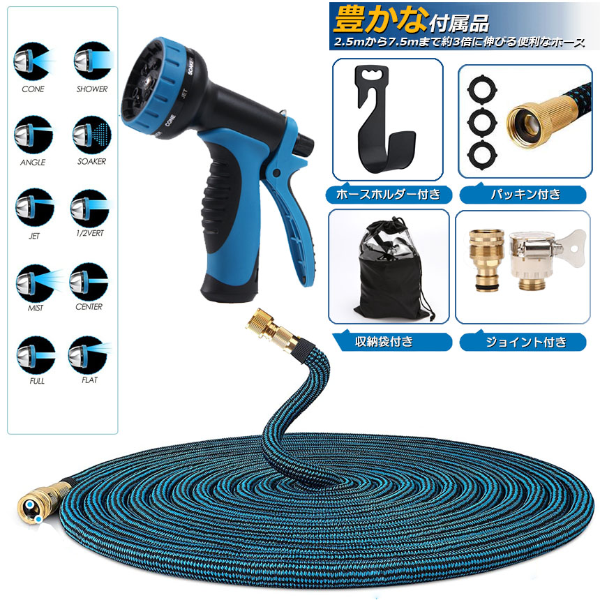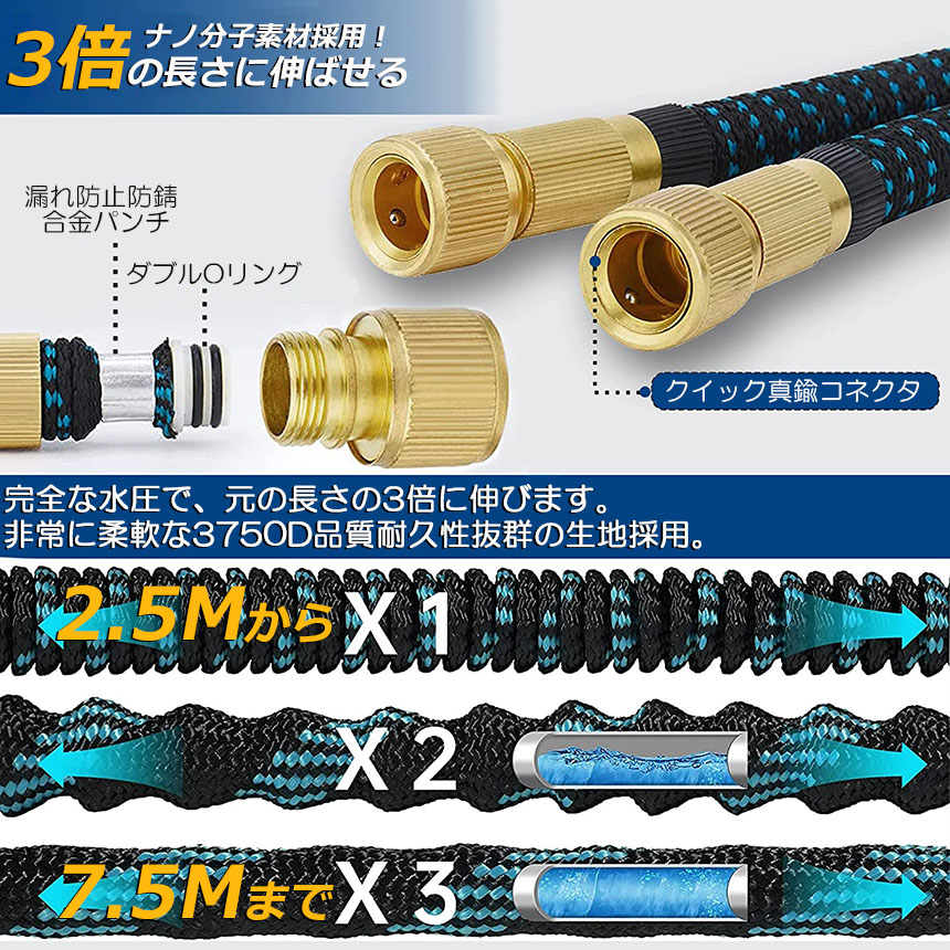 【3倍に伸びる】:収納時2.5m、最大7.5m、ホースを蛇口に取り付けてると、2.5mから7.5mまでホースが水圧で約3倍に伸びる便利なホース。(水圧によって最大限まで伸びれない場合があります)