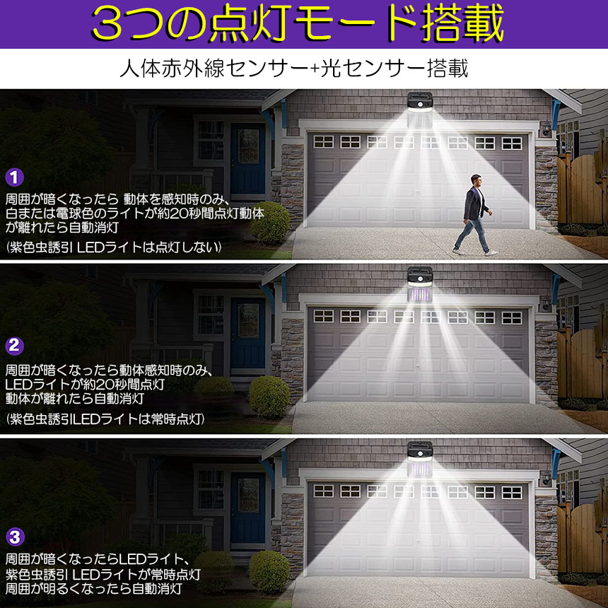 【多機能センサーライト】照明効果だけではなく、電撃殺虫器としても使えるセンサーライトです。16個LEDライトが搭載し、明るさは抜群で、バルコニー、廊下、パティオ、庭園、階段、外壁、ガレージ、歩道に明るく安全な環境を作り出し、より多くの照明エリアを提供して、停電、地震、台風など災害時、アウトドアシーンや緊急時まで、様々な場面でも活躍して優れるものです。光で虫を引き寄せ、電撃ショックで瞬間時に殺虫もできます。蚊・ハエなどを駆除し、快適にお過ごしいただけます。