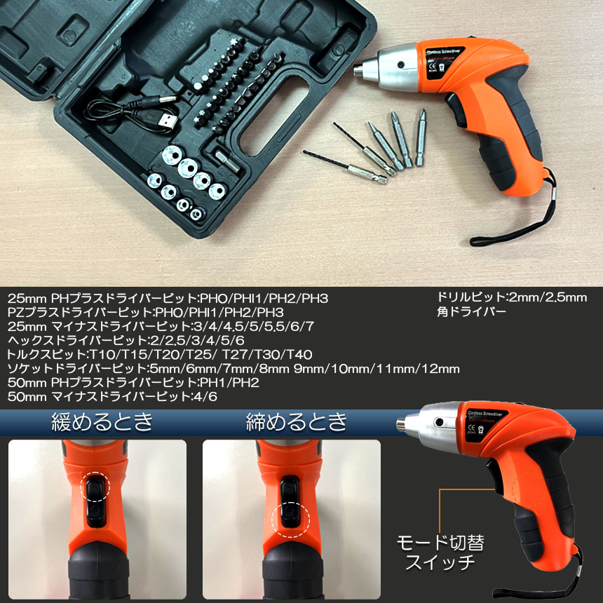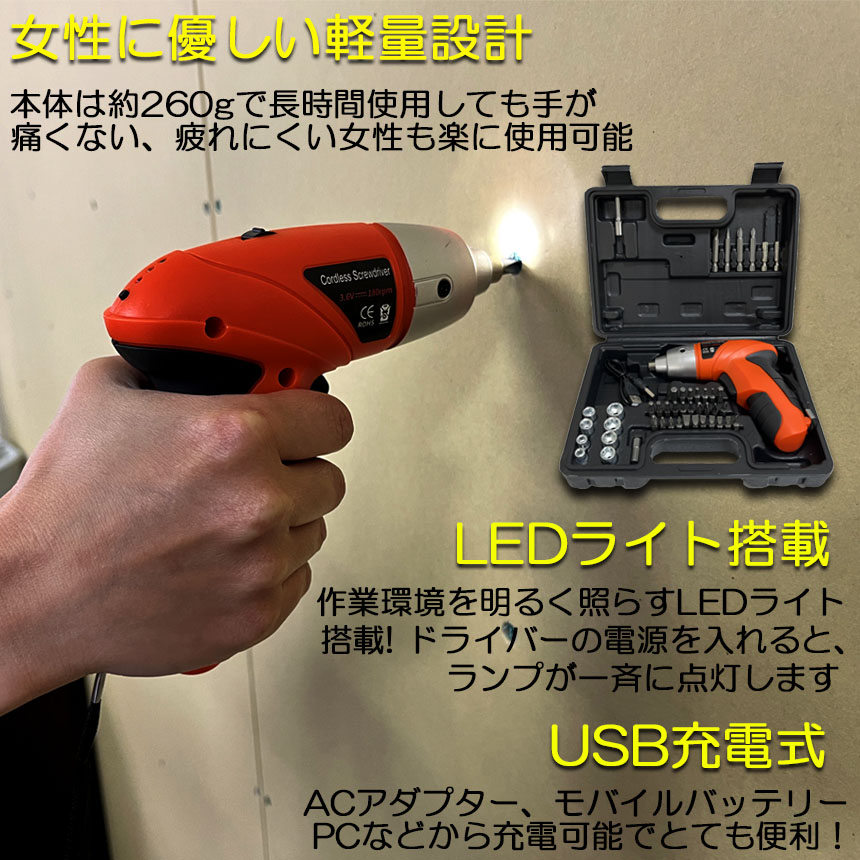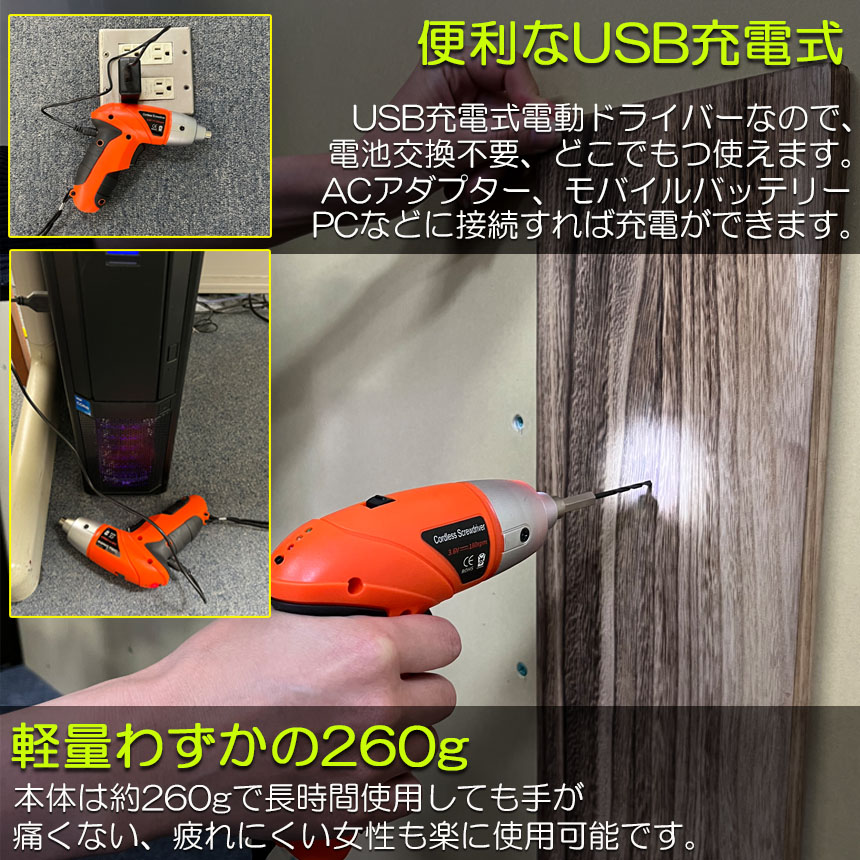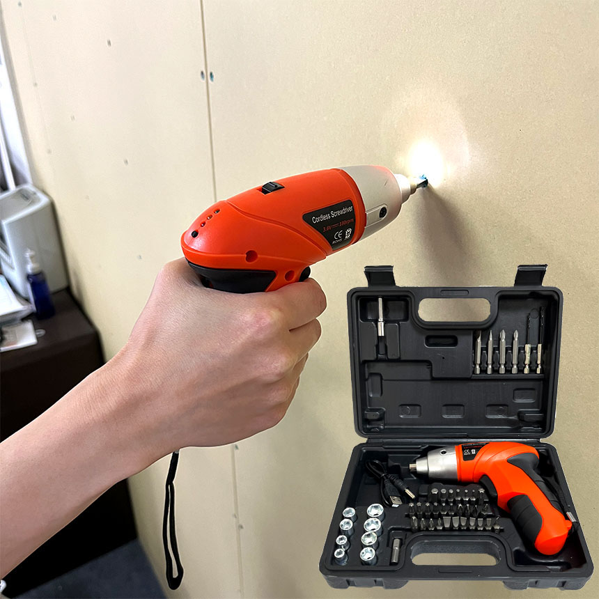 【小型軽量&多用途】小型でコンパクトの電動ドライバーは、グリップにはラバー加工で、滑り止め、しっかり握ることができ、様々な場合に利用できます。疲労感を緩めて、片手で操作することができます。 家具、電気機器などの組立をするだけでなく、木材・アルミ金属などの加工も適用します。(※注意:厚く硬い金属や壁など場所に利用しないでください。)
