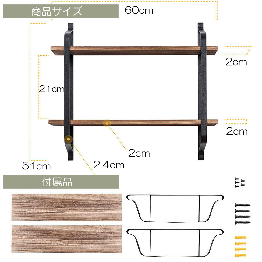 ●【大容量】小物の収納や、お気に入りの雑貨のディスプレイシェルフとして様々なシーンで活用できます。奥行も15cmもあり、写真、書籍、CDやレコードジャケット、キャンドルやアロマ、観葉植物や洋書などを飾れます。壁面を有効に使って、カフェ空間やショップのようなおしゃれなお部屋を目指します。棚板とはしごタイプのアイアンを組み合わせた存在感のある2段式です。棚板と金具をしっかりと固定することができ、棚板の落下を防止することができます。