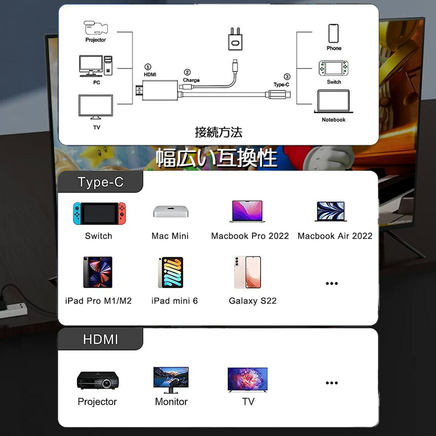 【持ち運び便利&テレビ出力】本製品はHDMIケーブル、PDポートとType-Cケーブルを含んだコンパクトの多機能アダプターです。HDMIケーブルを購入する必要はありません。また、テレビモード機能付き、遅延なし、スマフォン、パソコン、ゲーム機の画面をテレビ、モニター、プロジェクターに拡張表示できます。テレビモードの場合、大画面で友達や家族とみんなでゲームと映画などが体験できます。