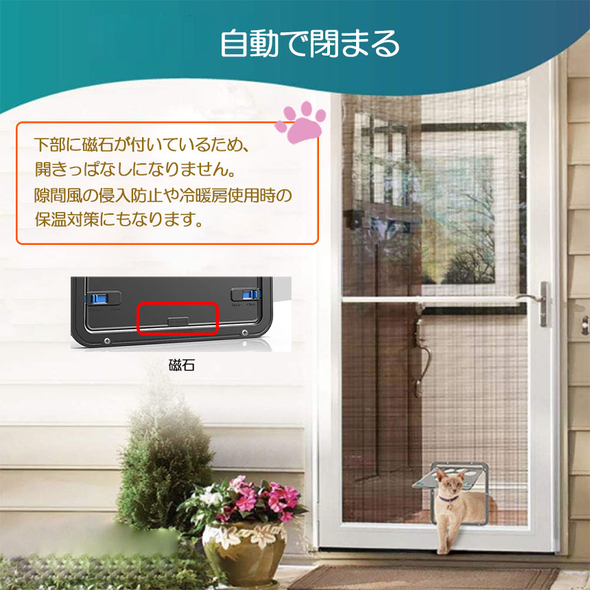 【静かさを与える】:開け閉めに声がしません。夜中飼い主がぐっすり眠れる同時に、犬や猫達にもより自由な生活があげられます。