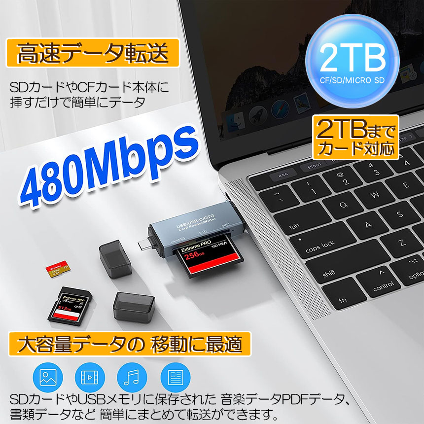 2in1カードリーダー】Type-cとUSB2.0の2種類の端子を組み合わせで、PCやOTG機能対応のタブレットやAndroidスマートフォンのデータ転送に最適します。(ご注意:Type-cはsonyには対応していないです。)