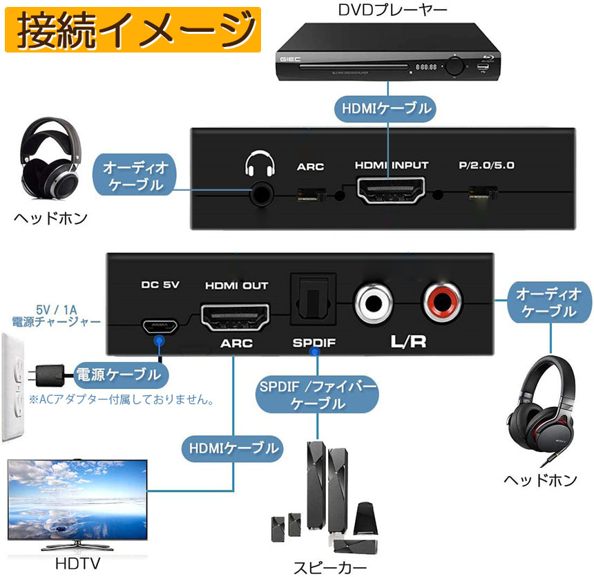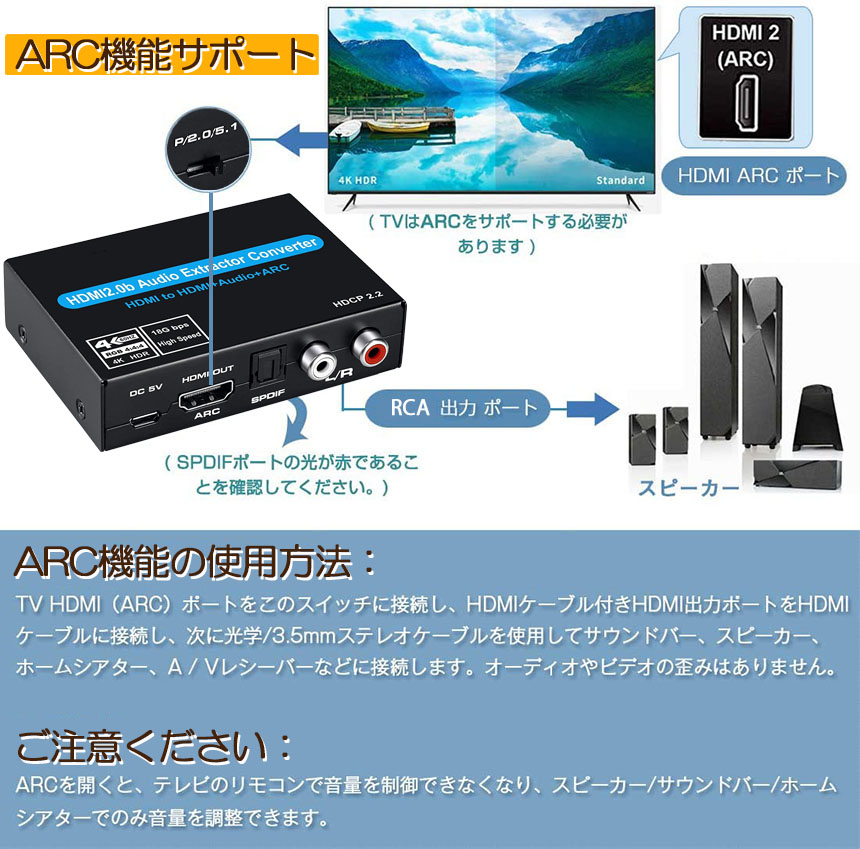 【ARC機能をサポート】内部のTV(HDTVチューナーや内蔵ストリーミングアプリなど)からARCコンバーターにHDMIケーブルを戻し、サウンドバー、ホームシアターなどの光ケーブル(付属)に、ARC機能は光SPDIFポートからのみ適しできます。