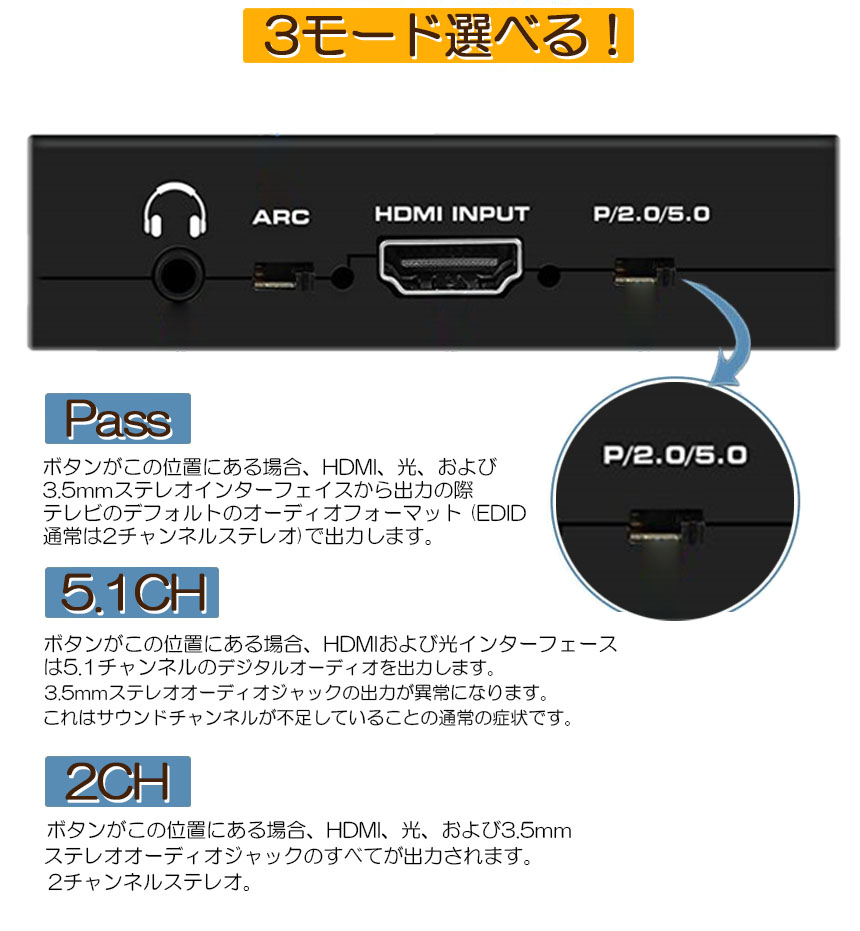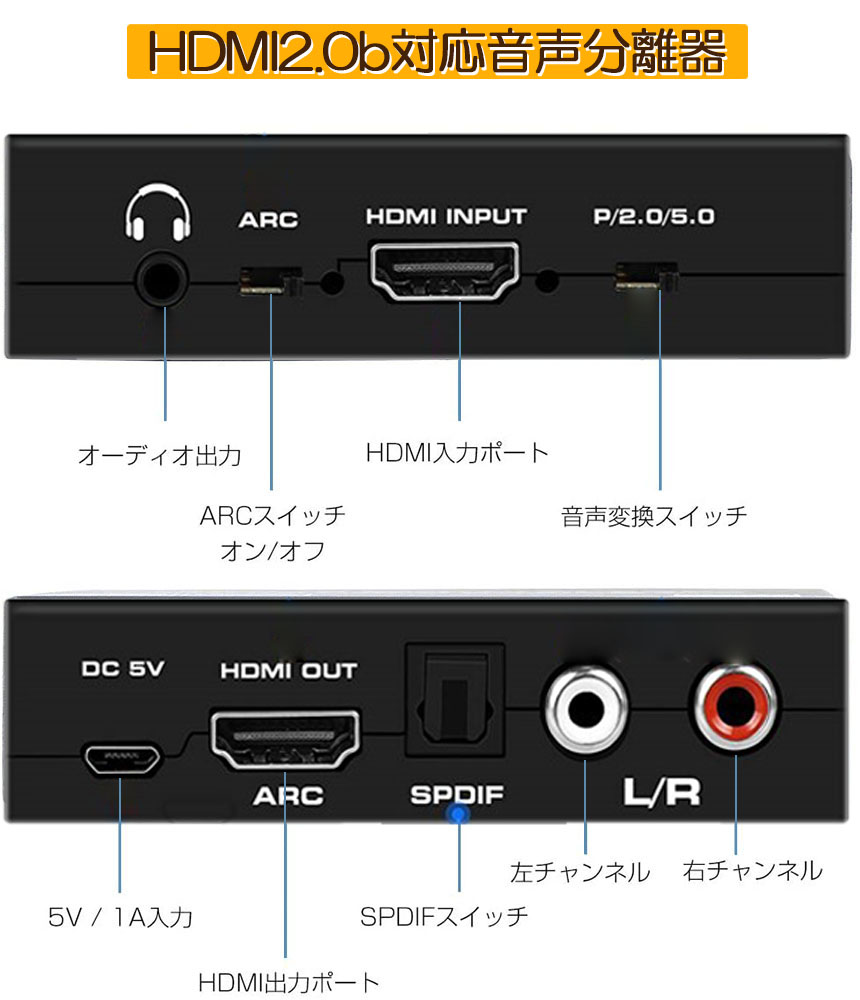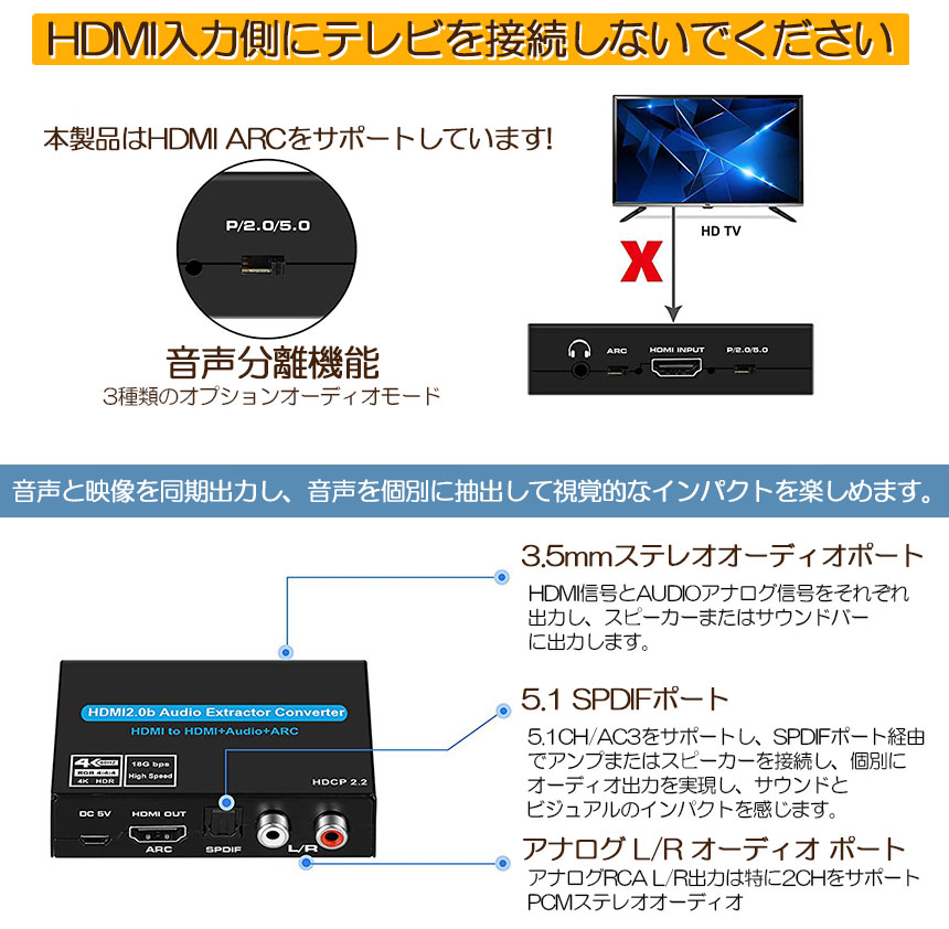 【オーディオ抽出】HDMI入力からデジタルhdmiオーディオ信号を抽出し、2チャネルのアナログステレオ出力またはマルチチャネルオーディオ(SPDIF)出力に変換します。▲注意:このデバイスはドルビーデジタル/ DTSオーディオ形式のみを渡し、これらの形式をアナログ出力用にデコードしません。アナログ出力を使用する場合は、HDMIソースがPCMオーディオに設定されていることを確認してください。
