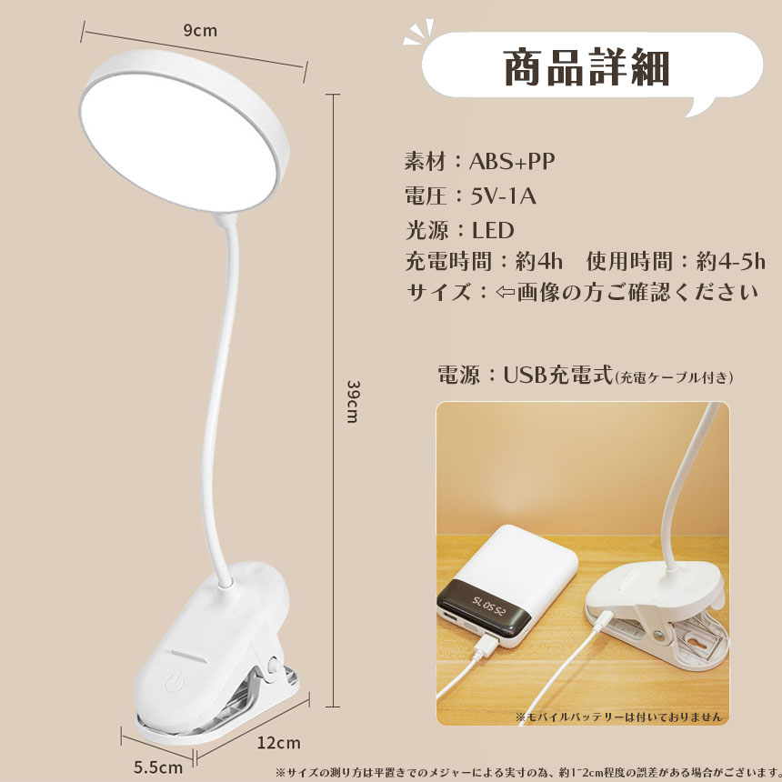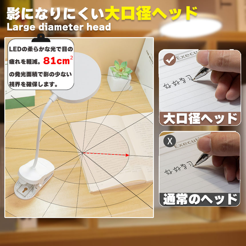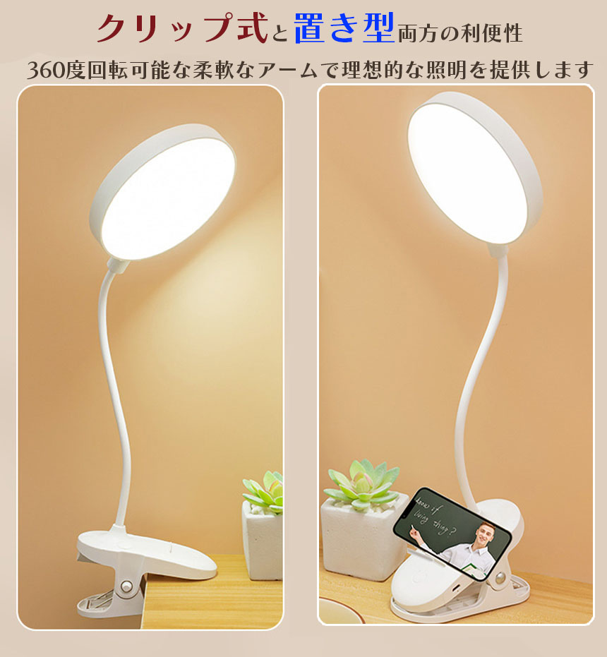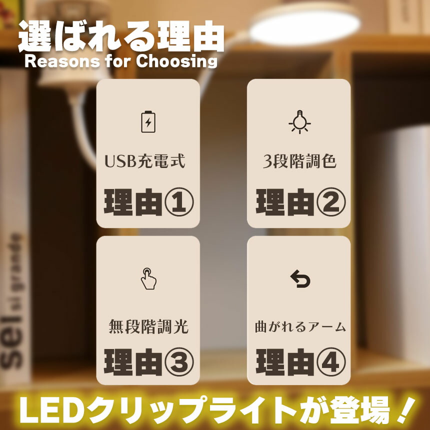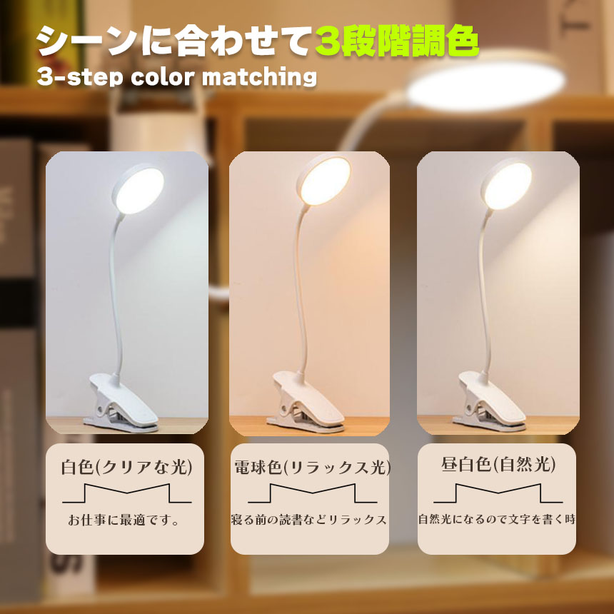 3段階調光 デスクライト クリップライト 読書灯 学習机 LED 目に優しい 勉強 おしゃれ 明るい調整可能 読書 シンプル 調光 クリップ式 置き型 充電式 USB<br>