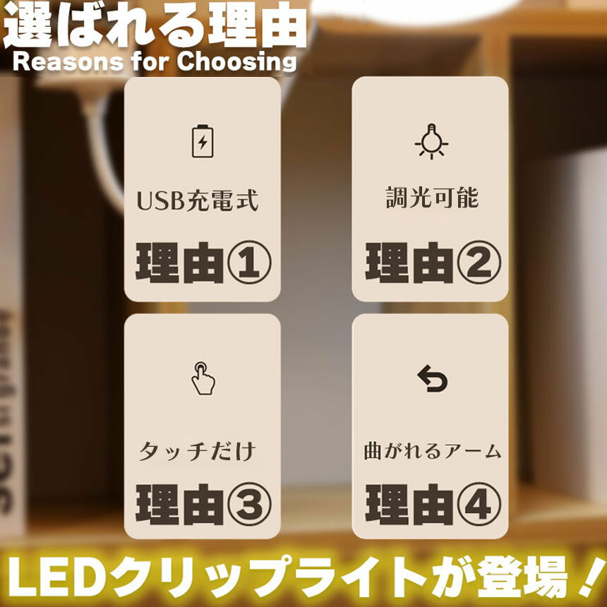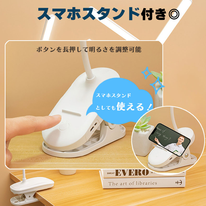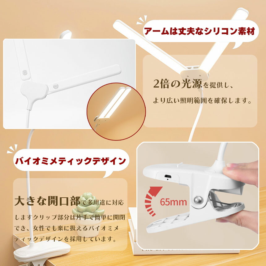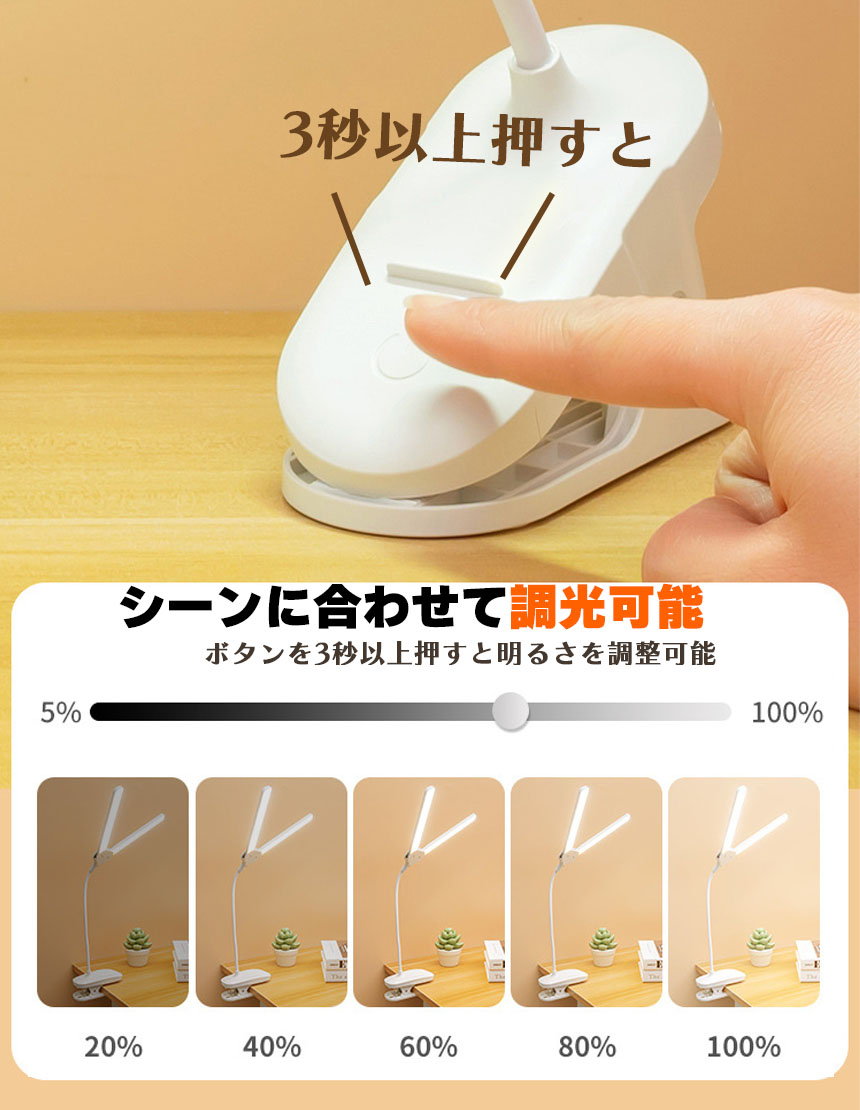 調光可能 デスクライト クリップライト 読書灯 学習机 LED 目に優しい 勉強 おしゃれ 明るい調整可能 読書 シンプル 調光 クリップ式 置き型 充電式 USB<br>