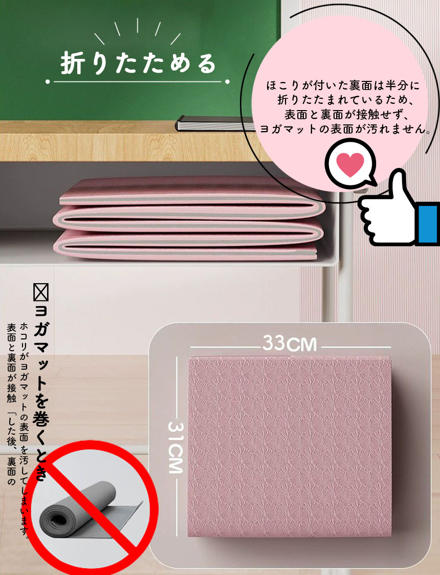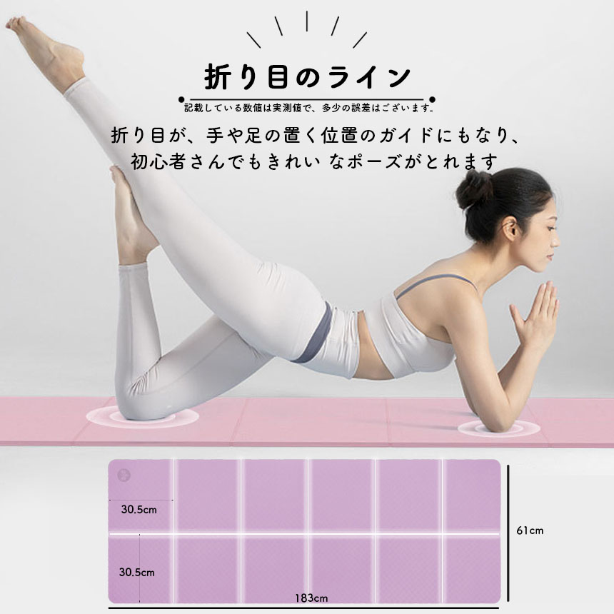 【適度なサイズで超軽量】長さ183cmx幅61cm x厚さ8mmで性別や身長を問わずどなたにでも理想的なサイズで、あらゆるレベルのヨギの方のプラクティスやフロアエクササイズのルーティンに適しています。折りたたみ設計でヨガスタジオやジムへの持ち運びも便利で楽々です。