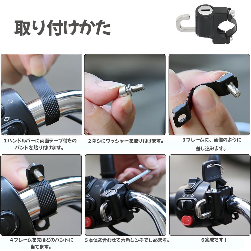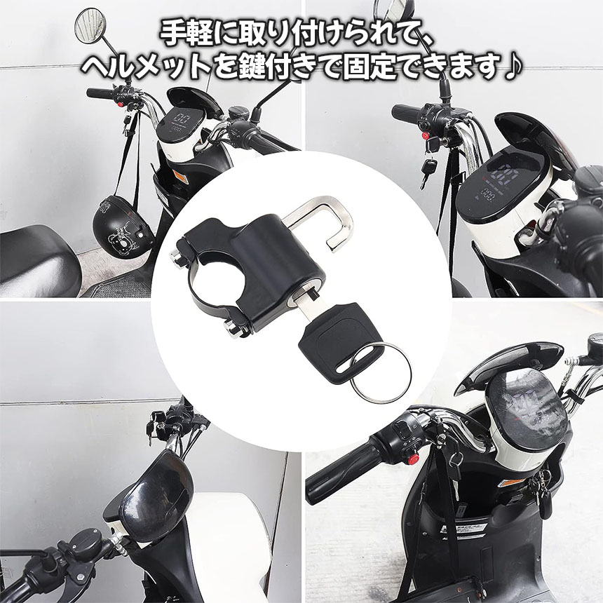 様々なバイクに対応した、簡単に取り付けられるヘルメットロックです。金属製で耐久性もあり盗難防止にもなります。