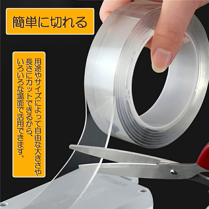 伸縮性があることにより、普通の両面テープでは貼り付けることが難しいものも難なく貼り付ける事が出来ます。煩わしいのりも残らなく、貼り付けた面にダメージを与えず綺麗に剥がせます。
