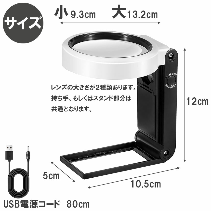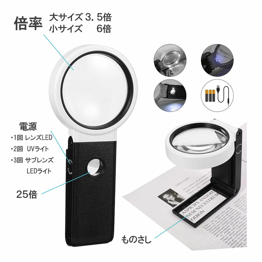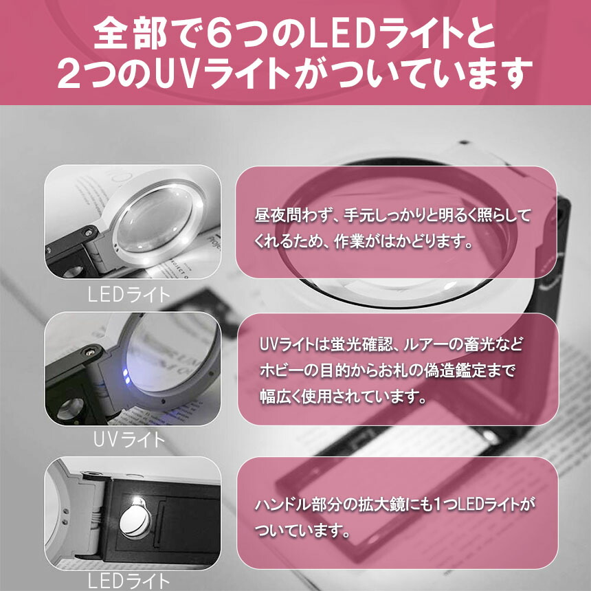 ・大レンズにLEDライト5つ、小鏡に1つ付き。3つの照明モードを切り替えて、暗い場所でも読書が可能で、デスクライトとしても便利です。UVライトで蛍光浸透傷のチェック、紙幣、骨董の鑑定などに使えます。