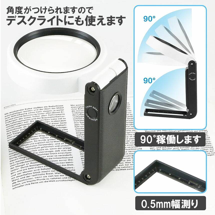 段階適角度調節可能、手持ち式とスタンド式両方使える拡大鏡!折りたたんだ時に手持ちルーペとして、広げると自立できるスタンドルーペ、2wayで読書や作業する時にとても便利です。