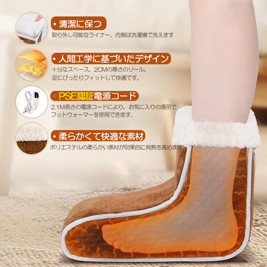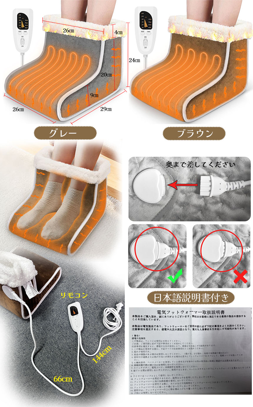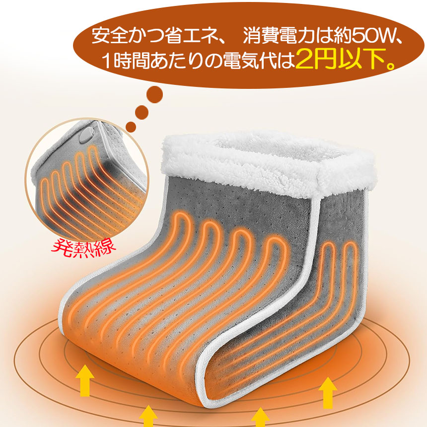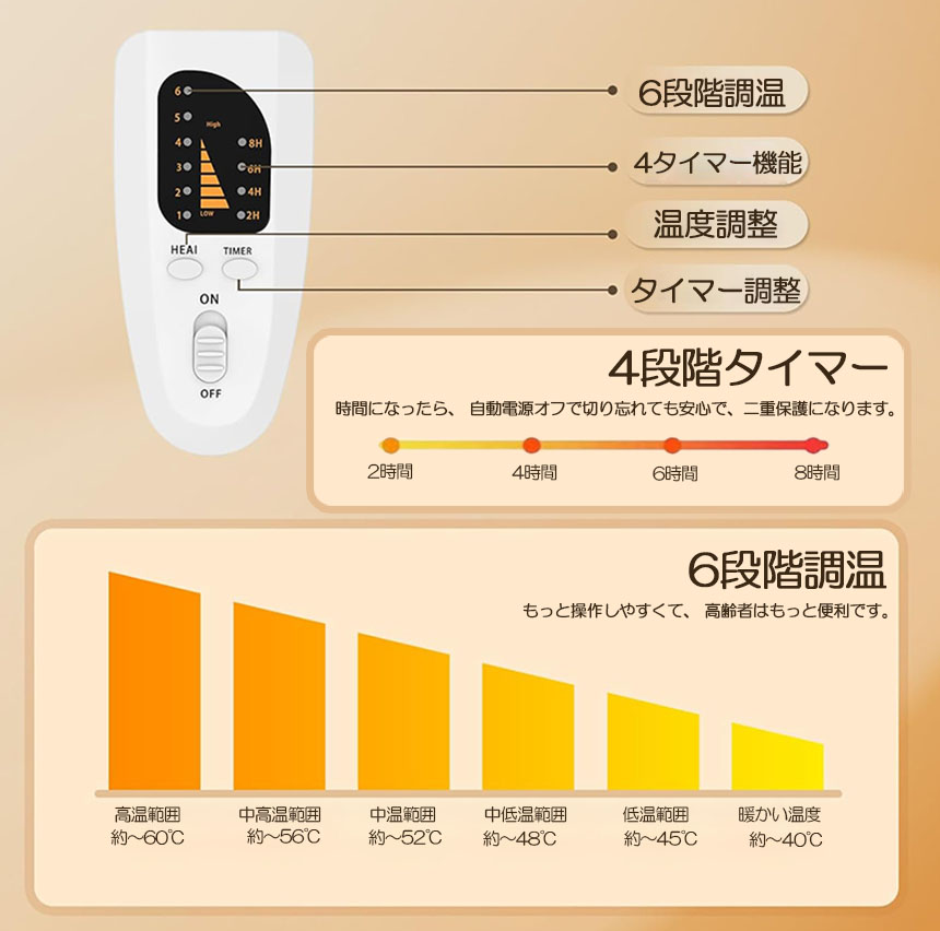 【6段階温度調節、4段階タイマー、過熱保護】電気足温器は6段階温度調節と4段階タイマー機能が搭載します。2・4・6・8時間切りタイマーと自動OFF機能付きなので消し忘れが心配な人にも時間を決めて使いたい人にも人気があります。外出時などに電源を切り忘れても、安心!また、フットウォーマーには加温度の上がりすぎを防ぐ安全機能付きから、温度が高くなると、高温保護に入って、自動的に停止して、火事の心配はいりません。何度でもお使え、お財布に優しいです。温度調整できるヒーター付きなので自分好みの暖かさに出来ます。