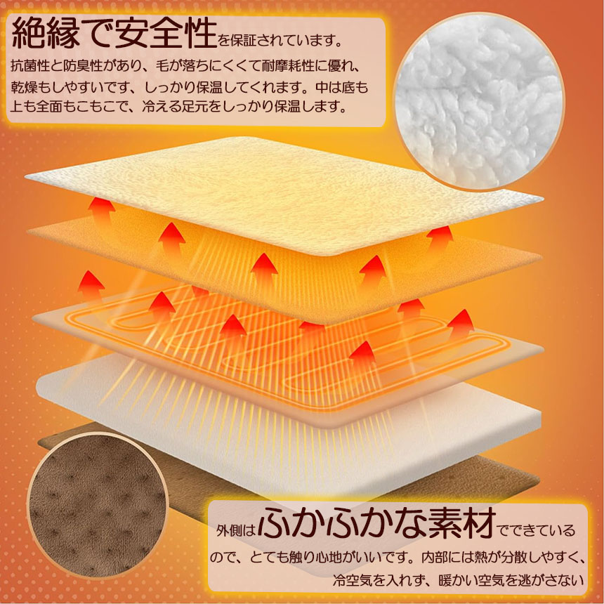 【ふわふわ暖かい 手触りがいい生地】足元ヒーターの外側はふかふかな素材でできているので、とても触り心地がいいです。内部には熱が分散しやすく、冷空気を入れず、暖かい空気を逃がさない生地を使用しています。絶縁で安全性を保証されています。抗菌性と防臭性があり、毛が落ちにくくて耐摩耗性に優れ、乾燥もしやすいです、しっかり保温してくれます。中は底も上も全面もこもこで、冷える足元をしっかり保温します。