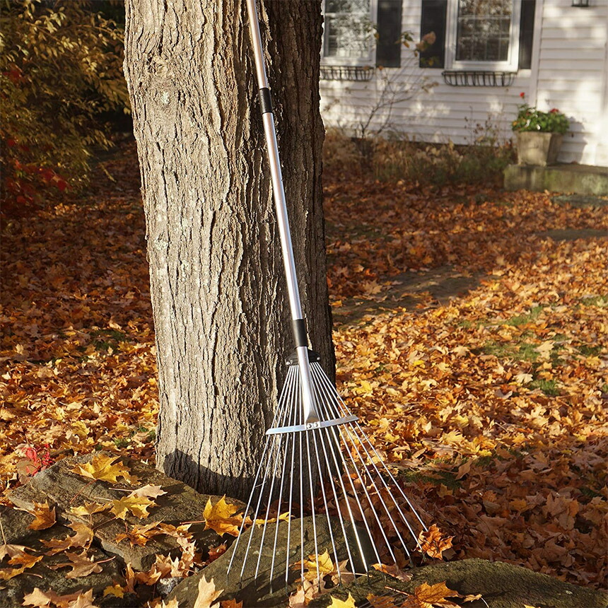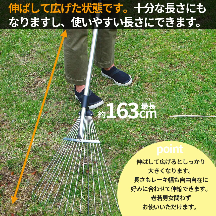 長さとレーキの幅を調整可能で、ワンタッチor回転で調整することができます。柄の部分を回転させることで77cmから163cmまでサイズ変更できます。15本の歯の幅は19~53cmで、その間のお好きな位置にロックでき、環境に合わせて効率的に葉を集めることができます。全長は163cm、折りたたみサイズは77cmです。ラその間のお好きな長さにロックすることができます。