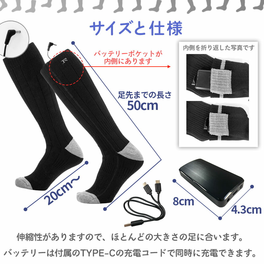 1セットの内容:電熱ソックス本体x1組、バッテリーx2、USB充電ケーブルx1(バッテリー側はTYPE-Cの二股です)