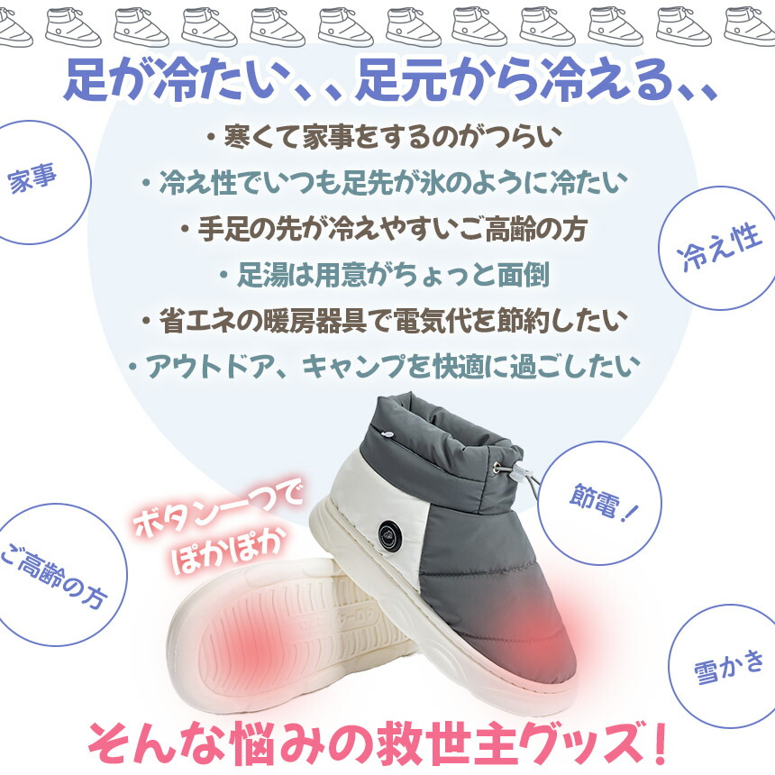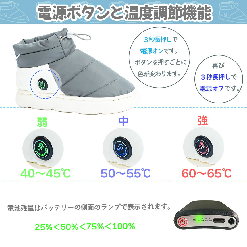 40~65℃まで、3段階の調節が可能です。低温から高温まで3段階の調節ができるのでお好みや周囲の環境に応じて自由に設定できます。おおよその温度は高温モード65℃(赤ランプ)、中温モード55℃(青ランプ)、低温モード45℃(緑ランプ)です。足元から暖まり身体までぽかぽか♪ボタンが1つなので、難しい操作はなく簡単に操作できます。そして、省エネルギーで環境にも優しいです。冷え性などの方は、なかなか暖まらない足先、ぽかぽかになって冬には不可欠なアイテムです。また底が約2.5cmの厚めでクッション性があり快適な歩行ができます。また、滑って転倒をしてしまわないよう、底面が滑りにくくなっています。