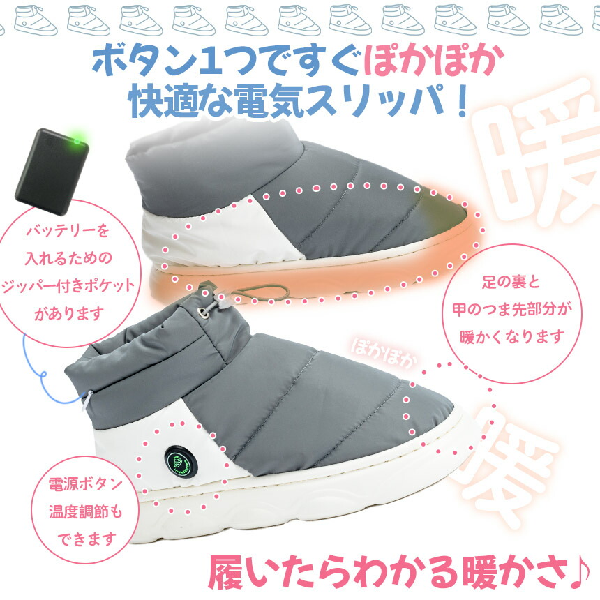 両足一体型の電気足温器ではなく、左右分離式のコードレスの電気スリッパです!バッテリー収納するファスナー付きポケットが付いていて、入っていることがわからないくらい目立たず、邪魔な電源コードなどは一切なしで、屋内でも履きながら家事をしたり歩き回れます!自宅のソファでくつろいだり、デスクワークでパソコンをするときや勉強、料理や家事をするとき等、さまざまなシーンで活躍するフットウォーマーです♪