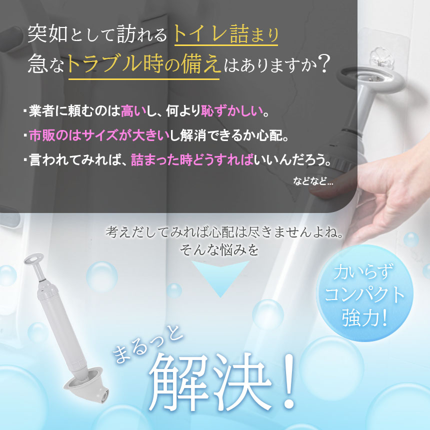 プロの現場で使われているツールの改良版の扱いやすく改善しやすいツール!今までのすっぽん(ラバーカップ)に比べ吸引力が高いのと、失敗が少ないといった特長があります。力も強い力が要らないので、女性でも使い勝手が良いです。トイレの詰まりは急に訪れて、直すのも一苦労。業者に頼むのもお金がかかるし恥ずかしいですよね。このツールがあれば、素早く解消することができます。