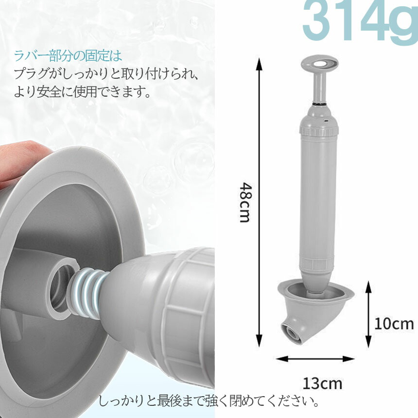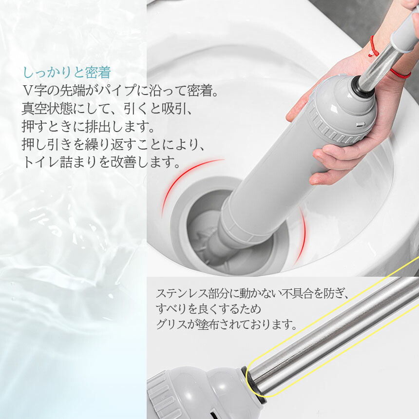 V字の先端、加圧式のポンプで水をしっかり密着して吸引排出するため、従来のすっぽん(ラバーカップ)に比べ効果絶大!細い先端は配管にフィットしやすく、操作がスムーズです。加圧式のハンドルで、押す、引くの2段階方式で使います。誰でも簡単に使えます。
