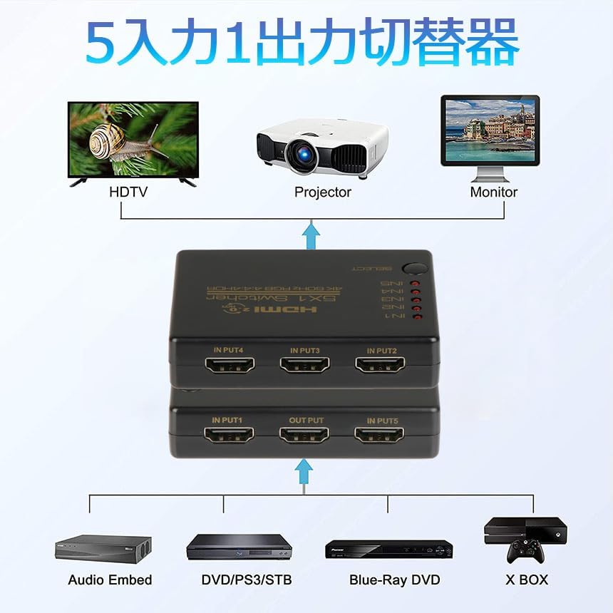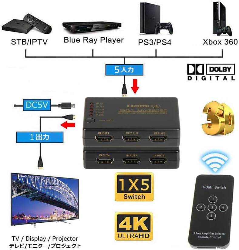 【HDMI切替器5入力1出力】本5ポートHDMI切替器は、5台のHDMI機器の映像・音声を切り替えて1台のテレビ/プロジェクターに出力ができるものです。即ち、テレビのHDMI入力端子が不足していても、ケーブルの差し替えをせずにHDMI機器を利用可能です。ホームシアター、オフィス、学校、会議室、ショッピングセンター、ホテルや博物館などに最適です。