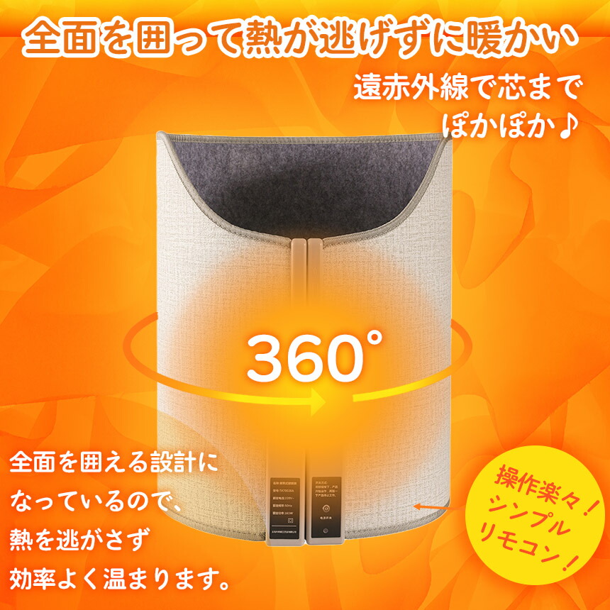 足元を360度温める巻くタイプのラウンド型パネルヒーターです。加熱面積が広くパネル全方位から暖かく包み込み、冷えた足元を温めます。