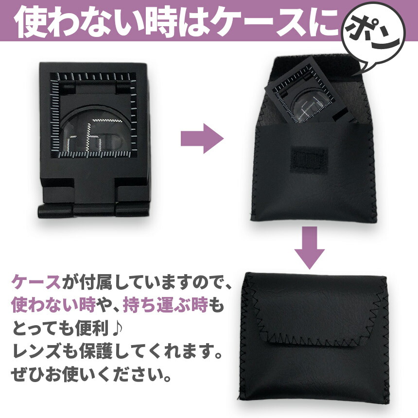 小さな携帯ルーペはポケットに入れても邪魔にならず、その辺に置いておいてもかさばりません。傷が気になる方もケース付きなので安心♪いつでもどこでもパッとすぐに使えて、読みにくい字も読めるようになる便利なグッズで、快適生活をお過ごしください。