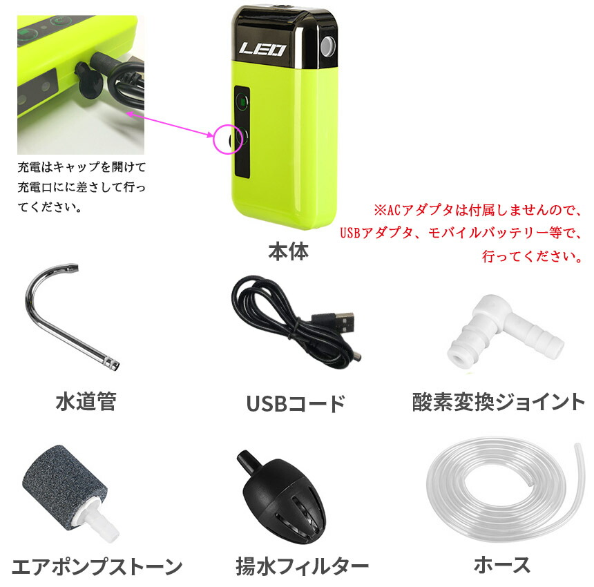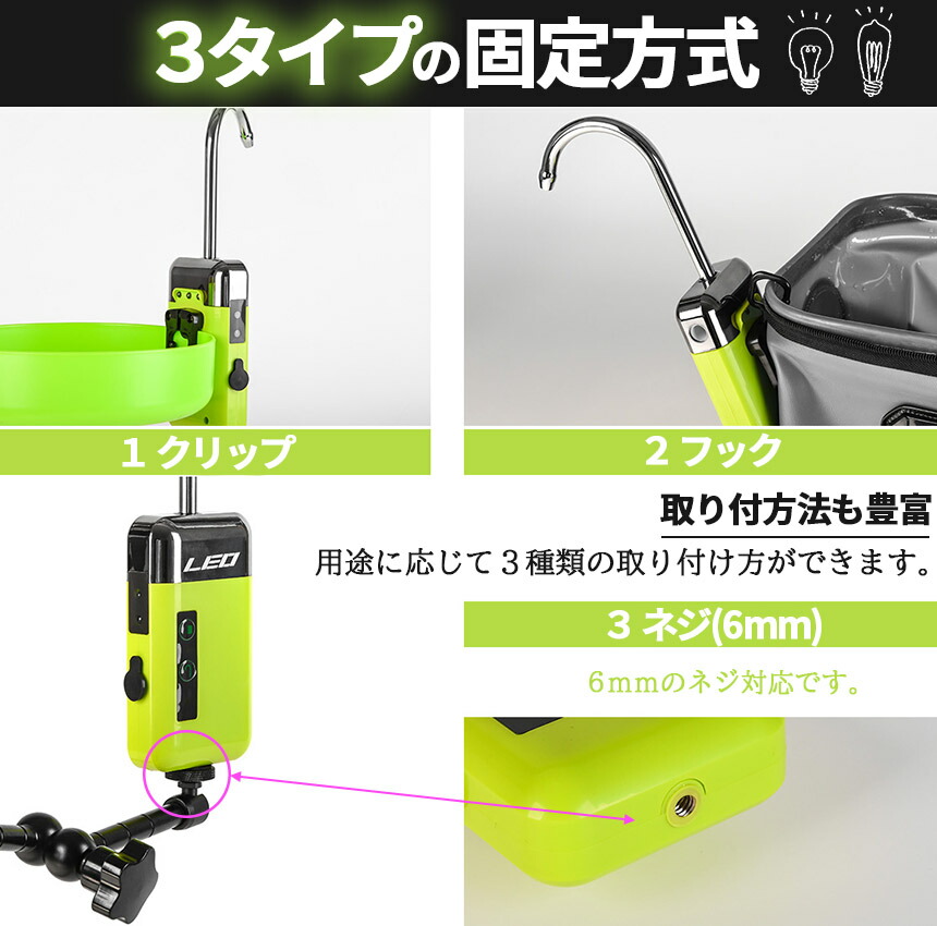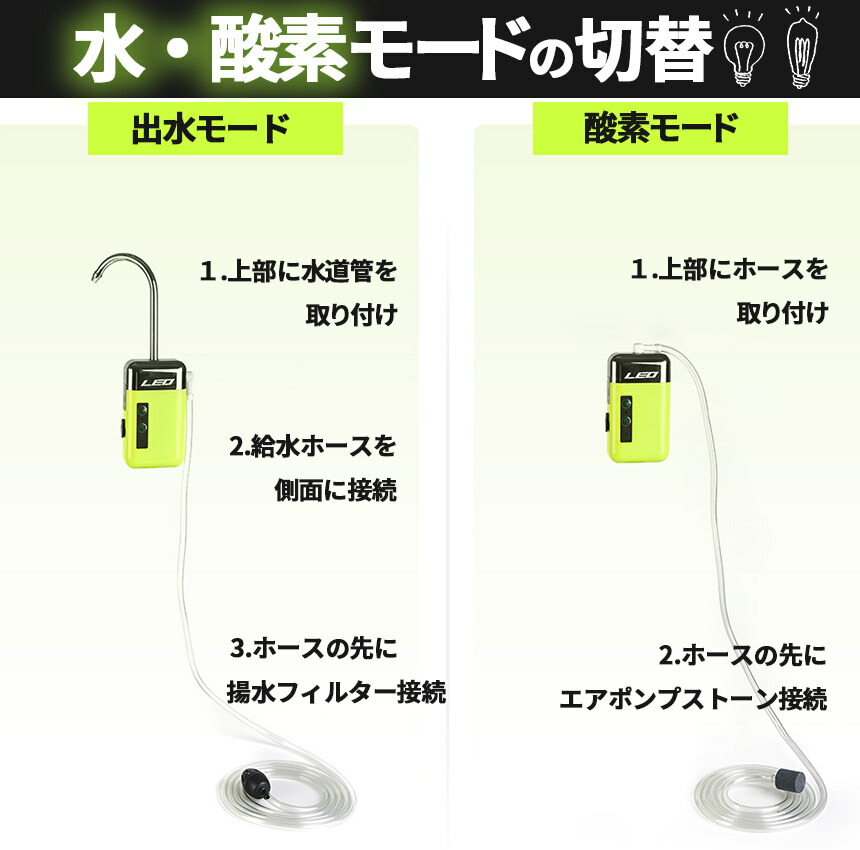 エアーモードでは、水槽への酸素供給用や、釣りなどで釣った魚を活かしておく際などに使用できます。ウォーターモードは、手洗いや給水、水の移動にも使えます。