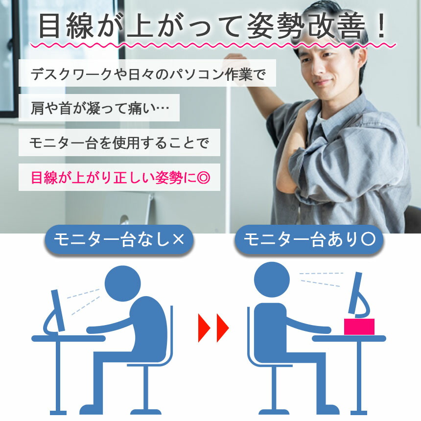 モニター台を置きモニターの位置も高くなることで、目線が上がり正しい姿勢に◎