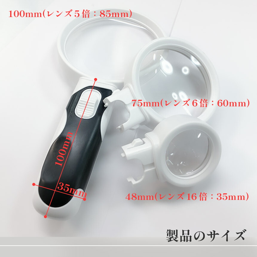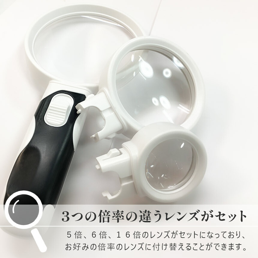 ・3種類のレンズがセットで、お好きな倍率に付け替えて使用できます。5倍もしくは6倍のレンズは新聞、雑誌、譜面、地図、観察など比較的大きなものを長時間見る時におすすめ!16倍のレンズは宝石鑑定、骨董品の鑑定や小さい物を見る時におすすめです。