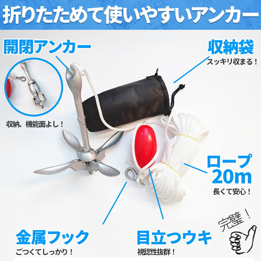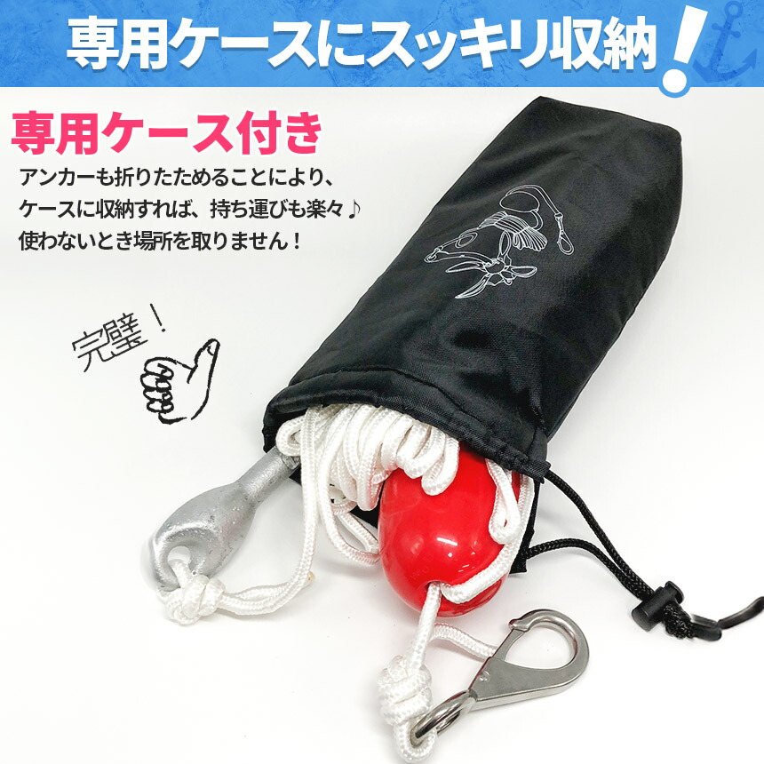収納ケースから取り出して、開いてすぐに使えるとっても利便性、携帯性の高い必要なものはこれでそろっているアンカーセットです。釣りやカヤック、ジェットスキーからヨットまで、幅広く活躍します♪しっかりと固定し、安心したレジャーやフィッシング等をお楽しみください。