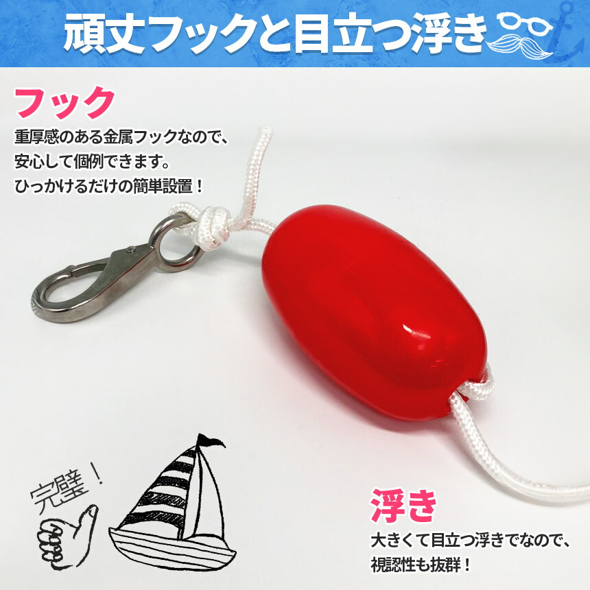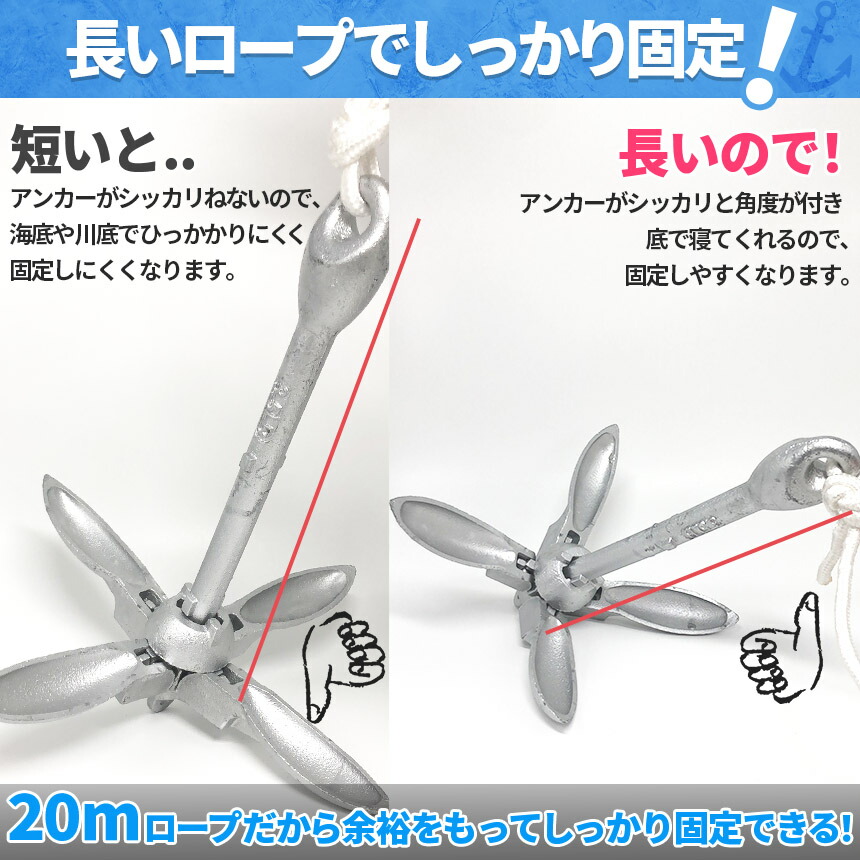 20mのロープによって、短すぎることのない安心して使える長さ。強風、潮の流れが強いときもフォールディングアンカーは対応し、その力を発揮します。収納できて邪魔にならないので、お持ちのパラシュートアンカー等と使い分けるのもよいと思います。