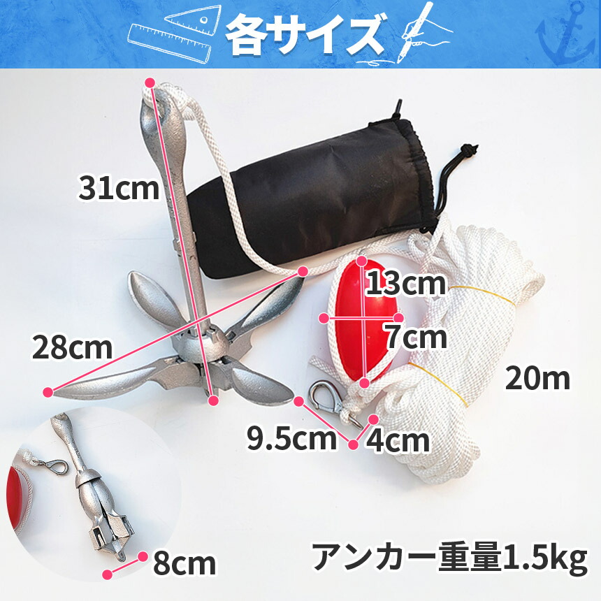 アンカー本体(1.5kg)、20mロープ、ブイボール、フック、収納ケース