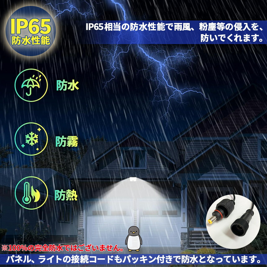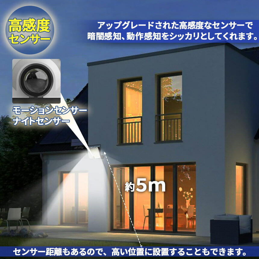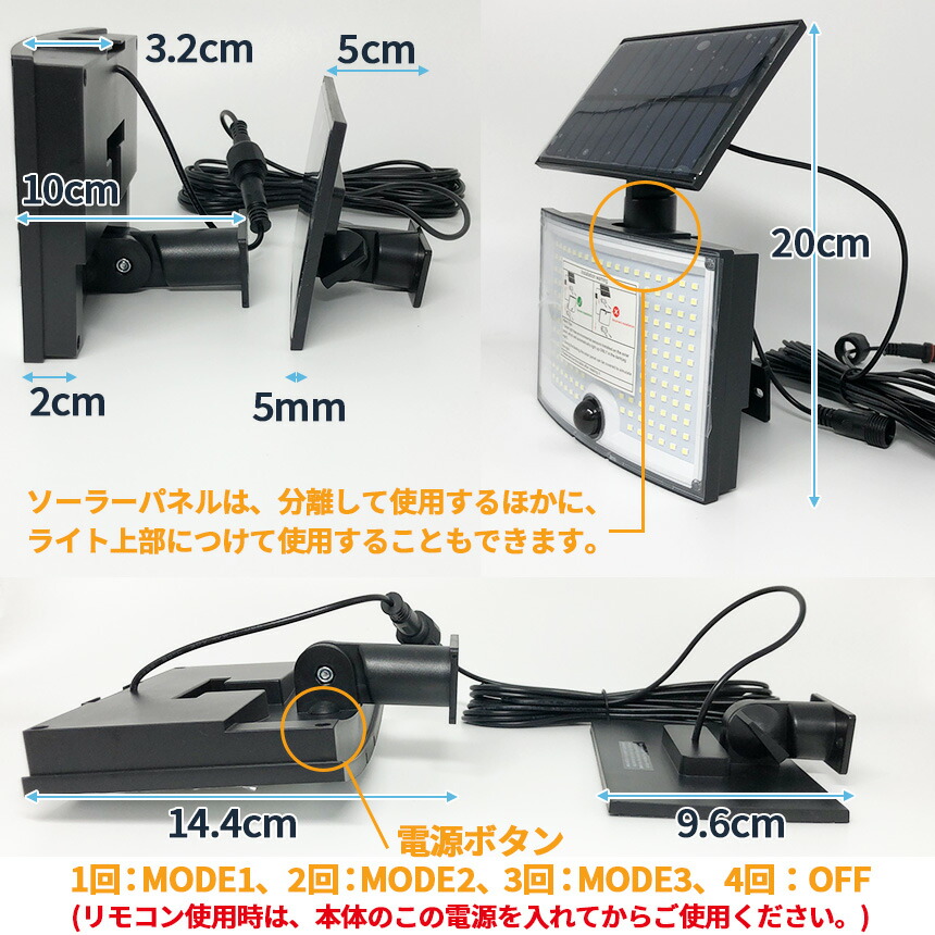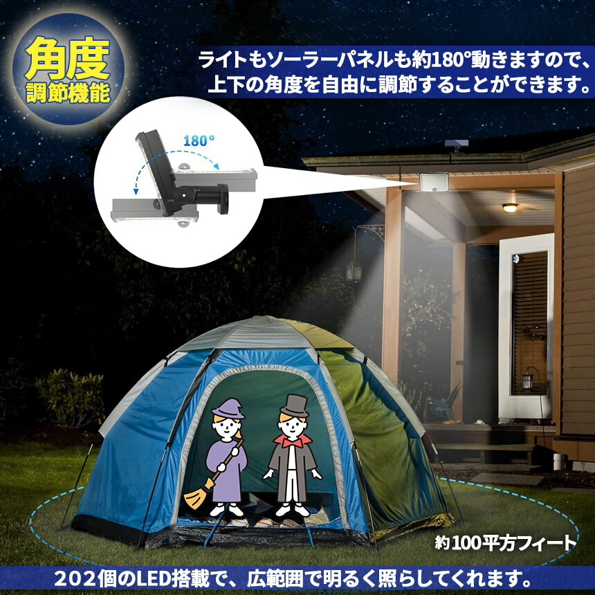 屋外ソーラーライトには202個のLEDチップが搭載しています。夜間の活動の安全性を確保するために、明るい光と、高感度センサー搭載。ソーラーパネルとライトを、5mのコードで別々に設置できます。ソーラーを太陽の良く当たる位置に設置、また方向へ向けられ、十分にソーラー充電できます。夜の防犯灯としてもすごく実 用的です。