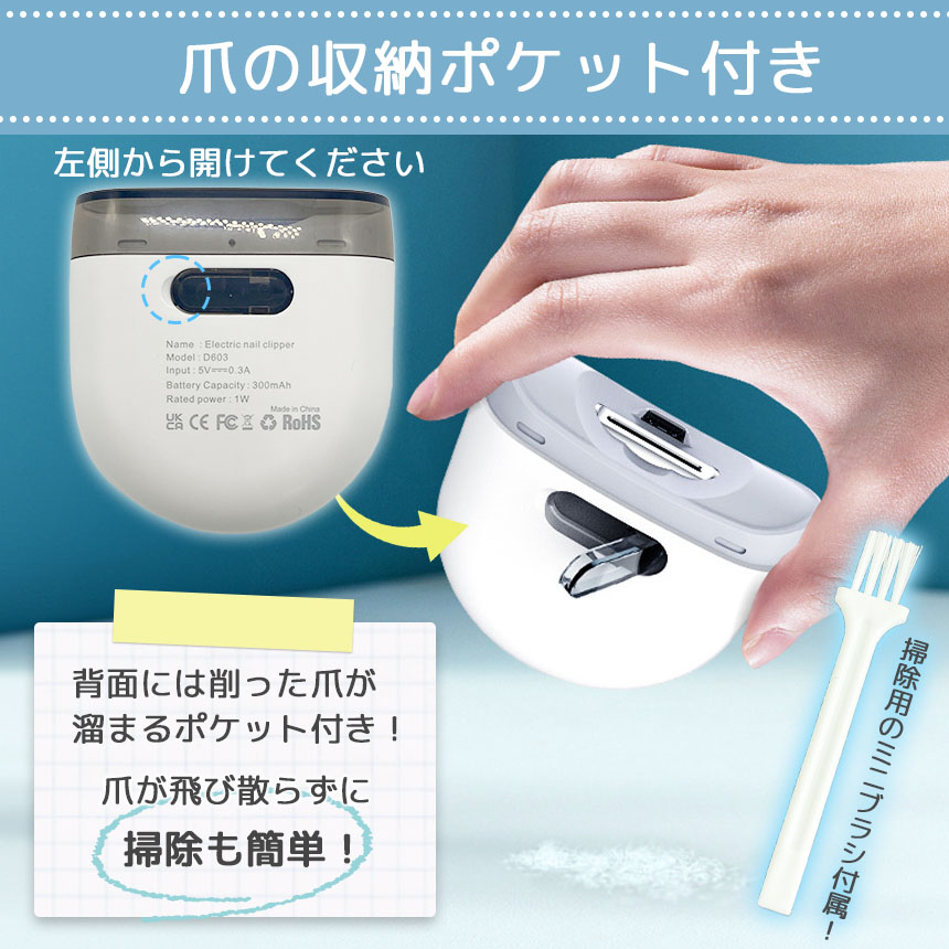 製品の裏面に削った爪を収納できるポケットが付いているので、ポケットを開けて捨てるだけで簡単に掃除ができます。
