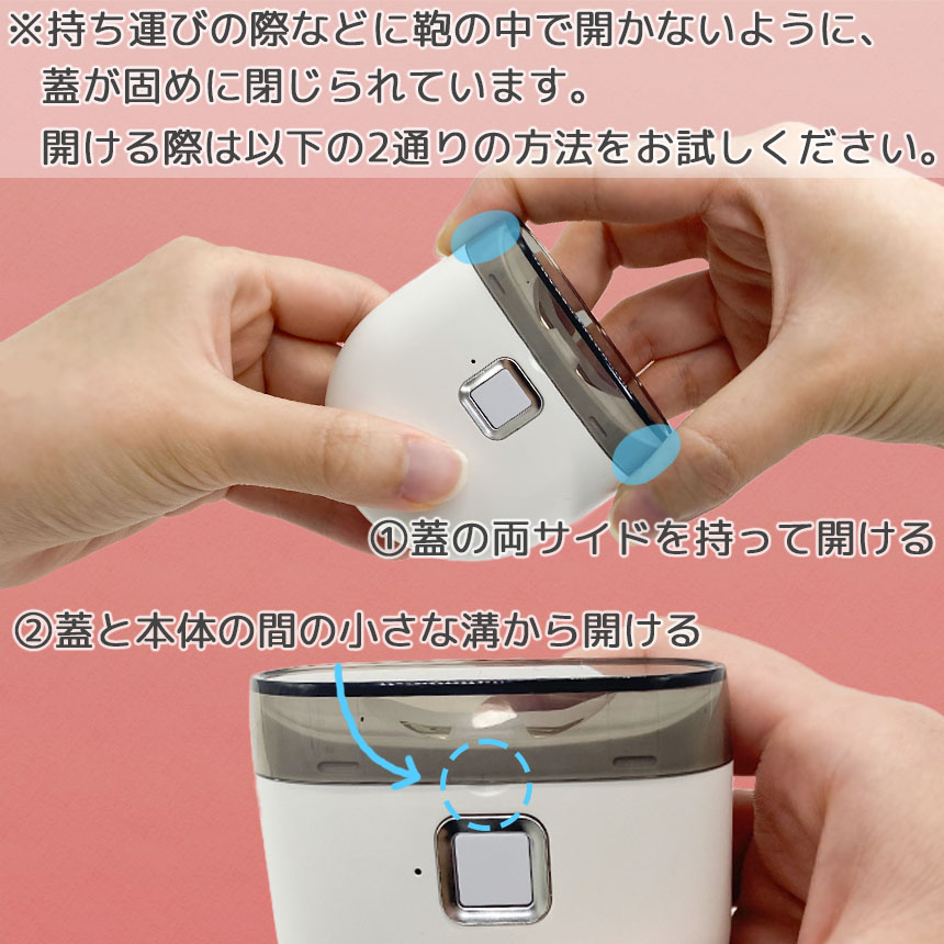 ・片方の手で爪切り本体、もう片方の手で蓋の両サイドを持って開ける