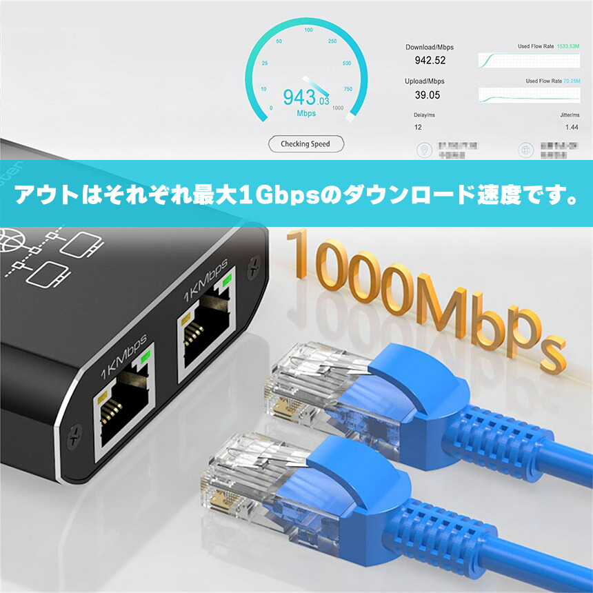 分配されたそれぞれが最大1000Mbpsまでの速度で同時に使用できます。入力出力共に1000Mbpsまでですので、それ以上は出ないことにご注意ください。また、接続時は各差込口ledランプでお知らせしてくれます。(電源:黄、ネット:緑)
