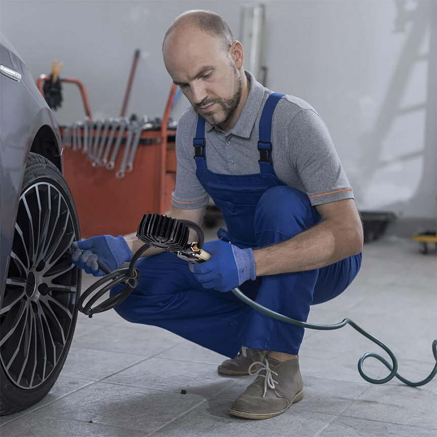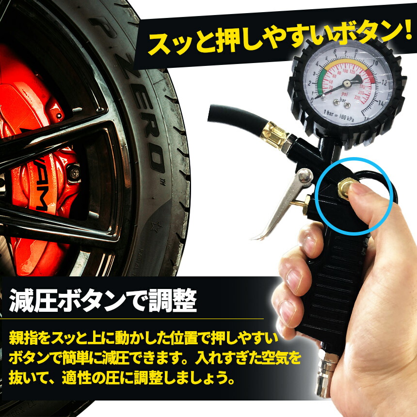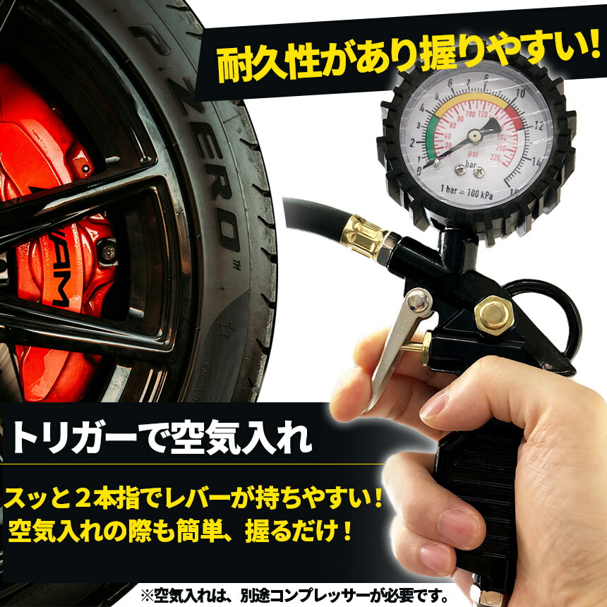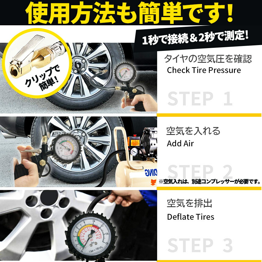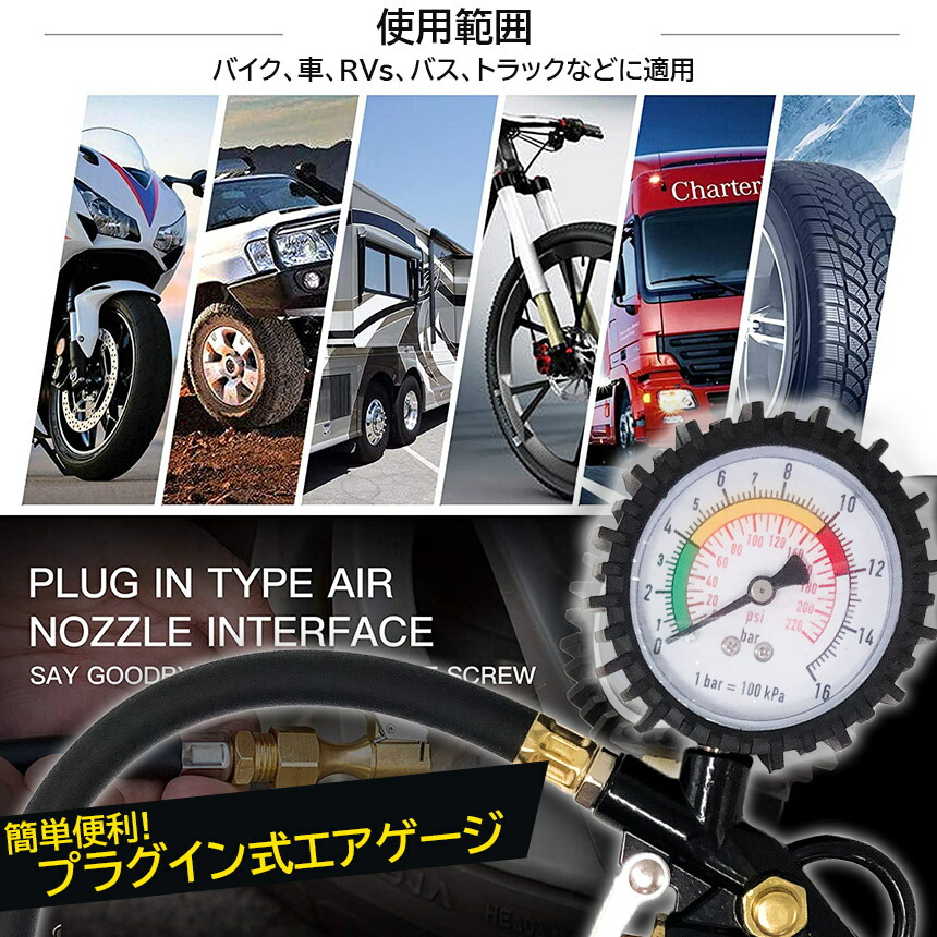 【対応性豊か】エアコンプレッサーとの併用は一本のレバーで行えます。インフレータ、ダイレクトロックチャック、圧力計、ホース、デフレバルブが1つに。デフレ、空気圧チェック機能を備えています。 1/4インチおよび1/2インチNPTエアコンプレッサー出力に対応。