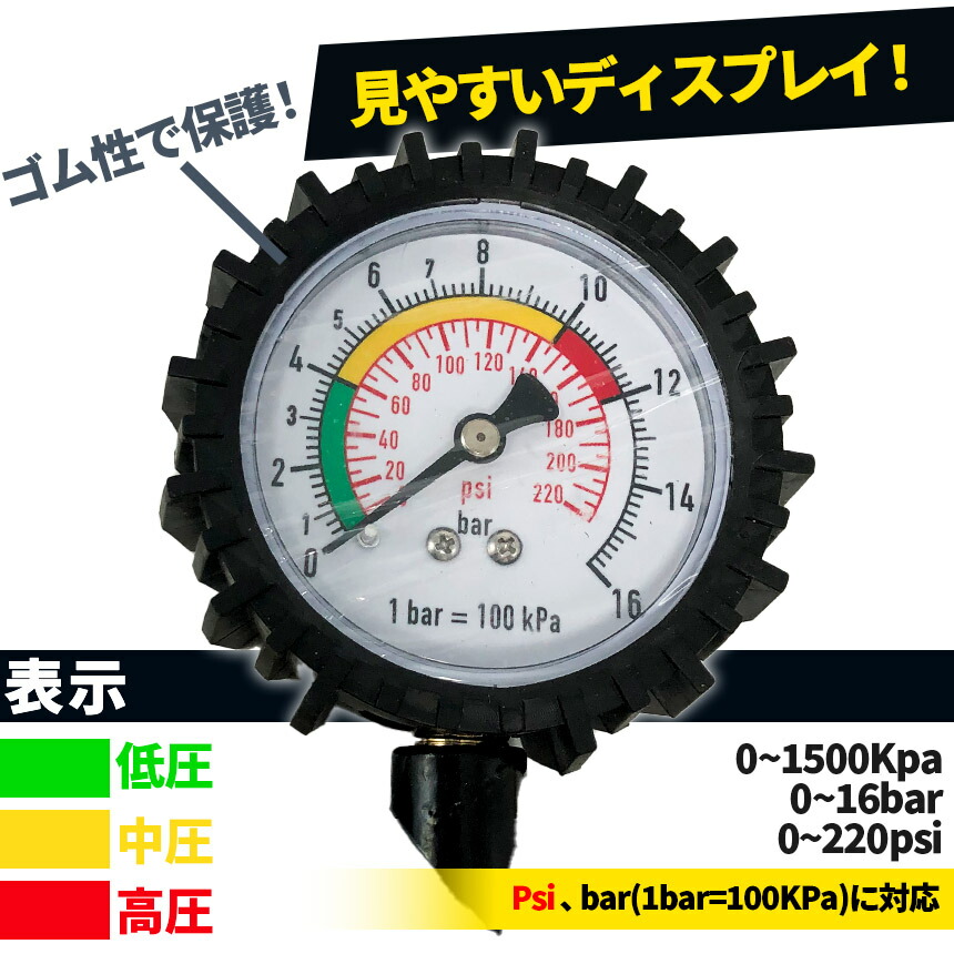 【見やすいアナログ目盛り表示】低圧、中圧、高圧の目安の色分けもあり、視認性抜群です。